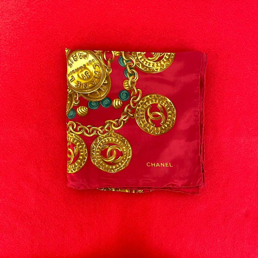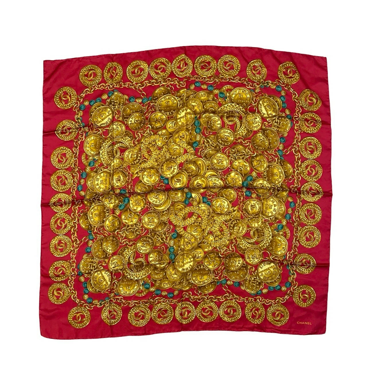 Very rare, mint condition CHANEL Coco Mark motif silk scarf, women's apparel, red, item number 80108 (pre-owned).