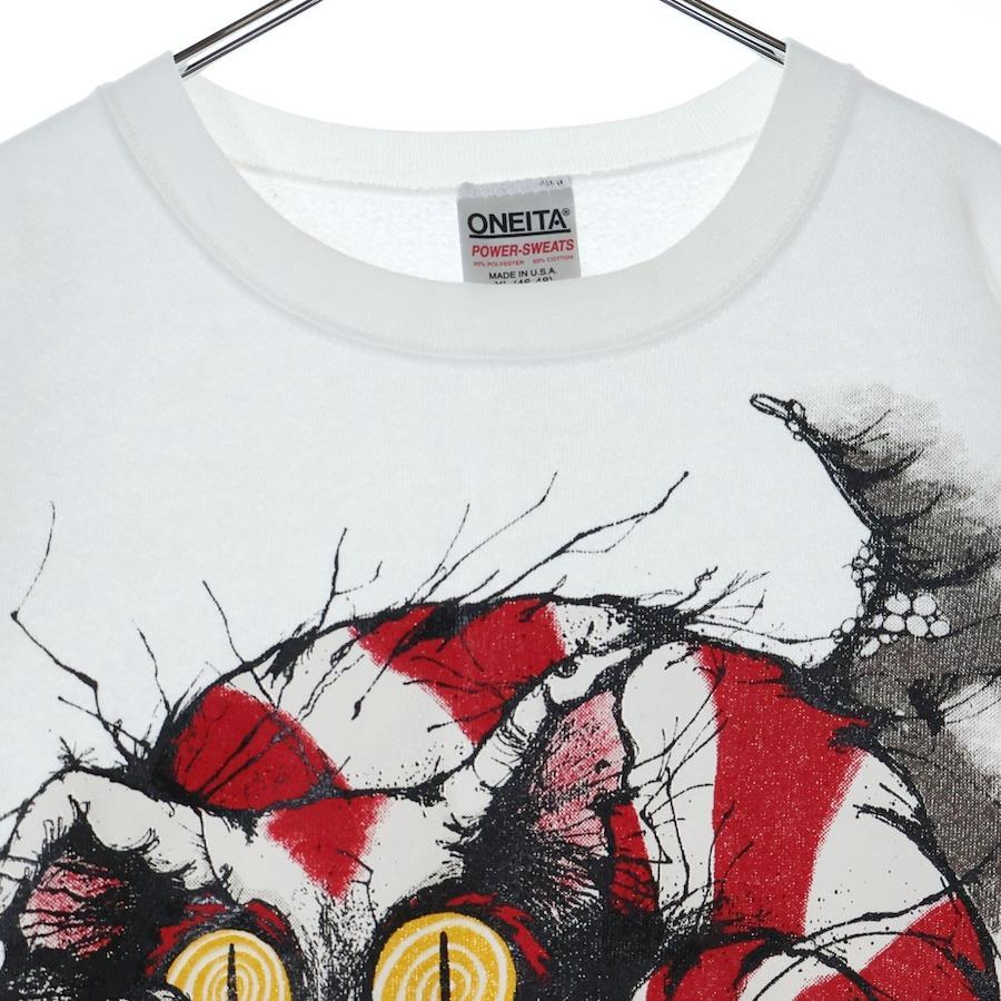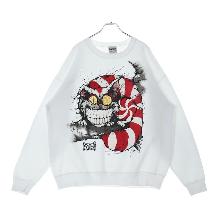 [モデル]90s ONEITAタグ USA製 不思議の国のアリス チェシャ猫 フロントプリント クルーネック スウェットトレーナー ホワイト