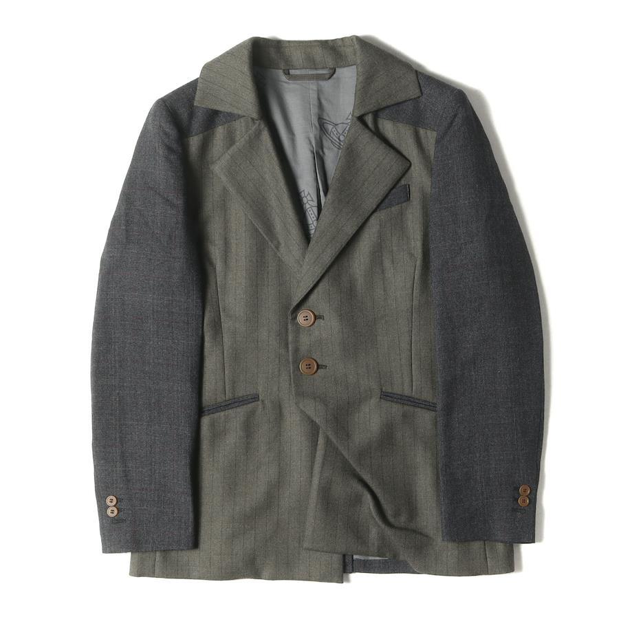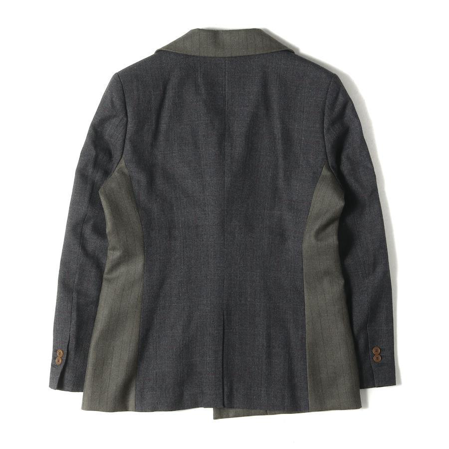 | 商品説明 | 柔らかなウール素材を使用し、グレンチェック柄とピンストライプ柄をミックスし、フロントは2つボタン、オーブ柄総裏地、袖裏ストライプ柄裏地、袖先フェイク1つボタンと本切羽2つボタン、フロントダーツ、センターベント仕様、変形デザインで仕上げられた"Distortion Mix Jacket"です。 |