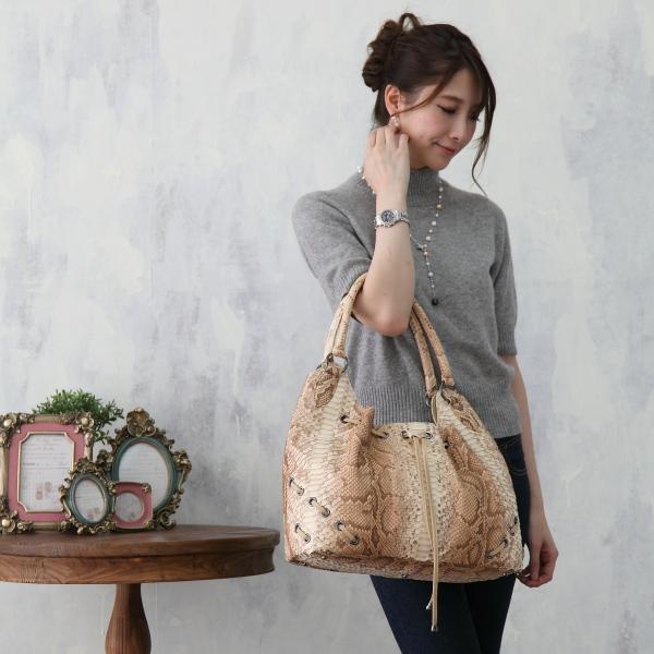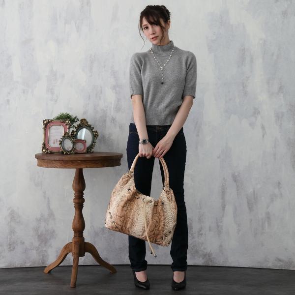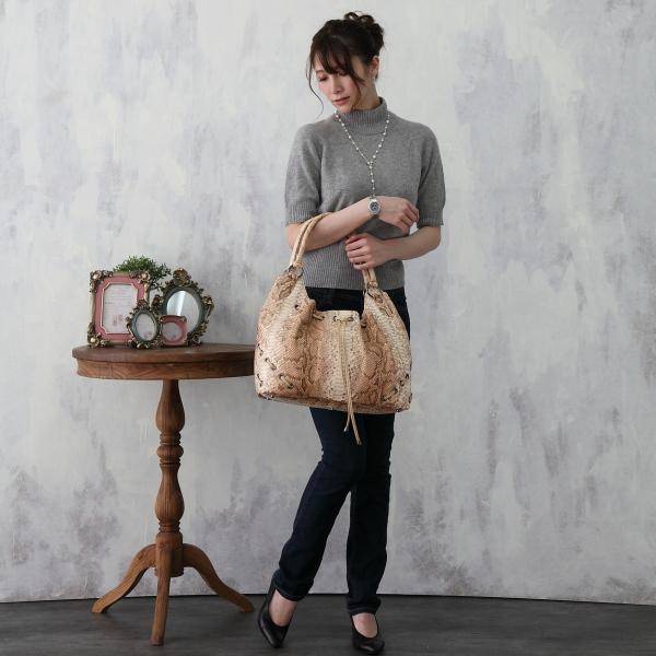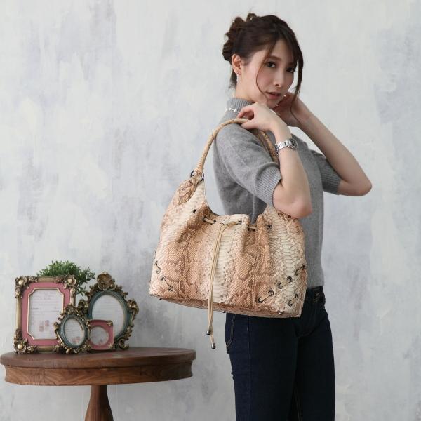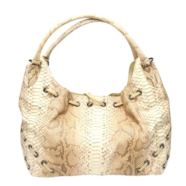 キャメルを基調とした立体的で特徴的なカラーリングのパイソンのショルダーバッグ