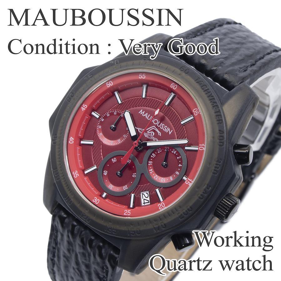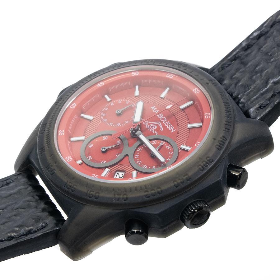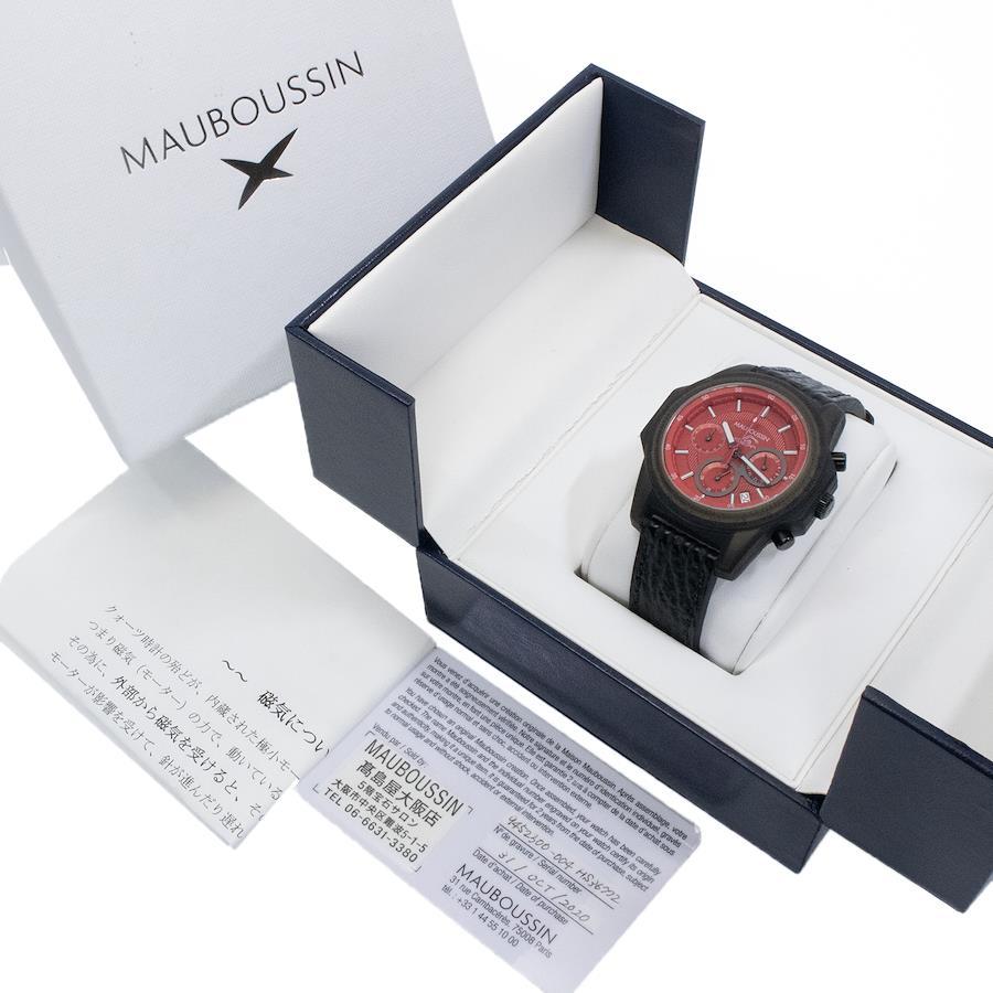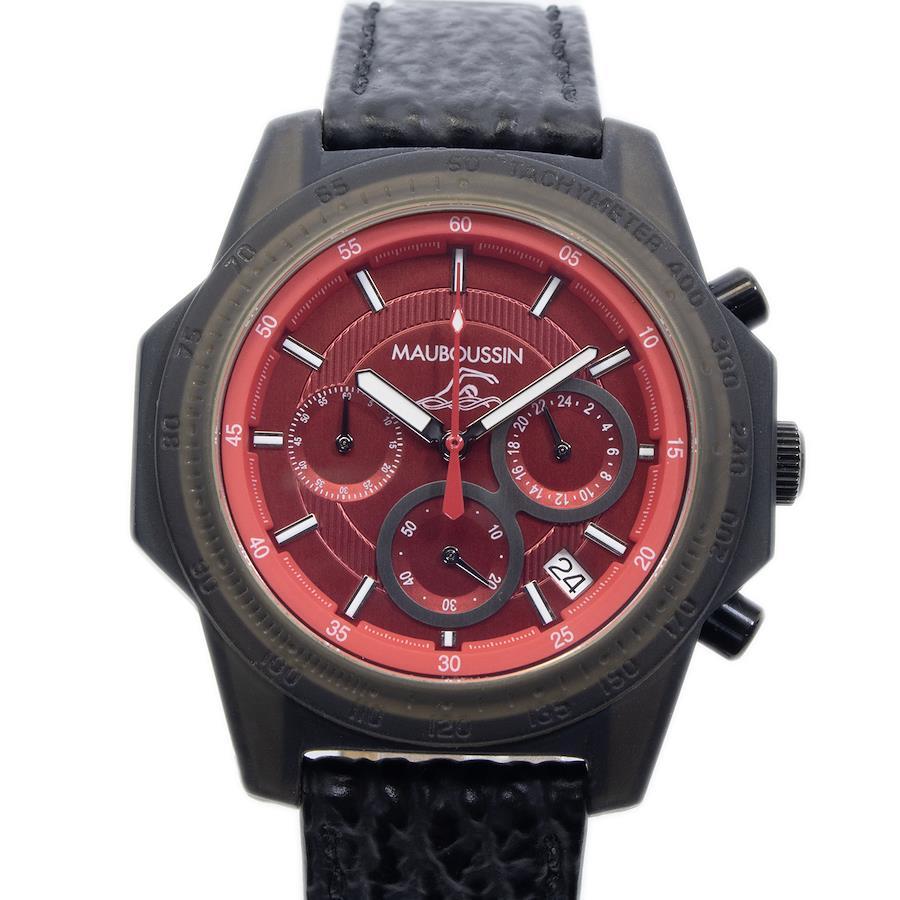 こちらは、情熱的な赤が手元で圧倒的な存在感を放たれる、モーブッサンの腕時計でございます。