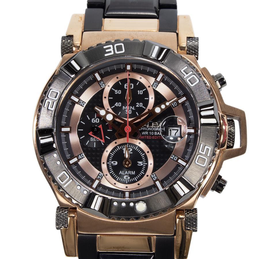 ・クロノグラフ・逆回転ベゼル・リューズカバー・アラーム・カレンダー(デイト表示)・10気圧防水
