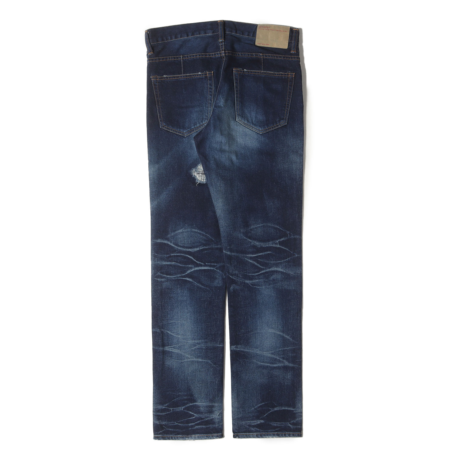 | 商品説明 | ヴィンテージ・ダメージリペア加工を施し、ストレートのスキニーシルエットで仕上げたジッパーフライデニムパンツになります。 |