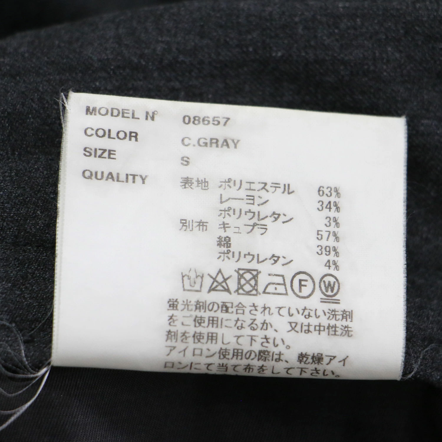 | 素材 | 表地 ポリエステル 63% レーヨン 34% ポリウレタン 3% 別布 キュプラ 57% コットン 39% ポリウレタン 4% |