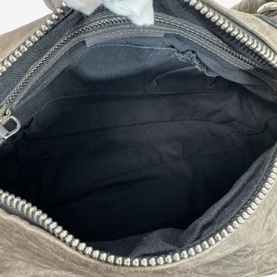 表面に擦れ傷とシワ、持ち手に黒い汚れ、マグネットとファスナーの金具に小傷と色褪せがあります。