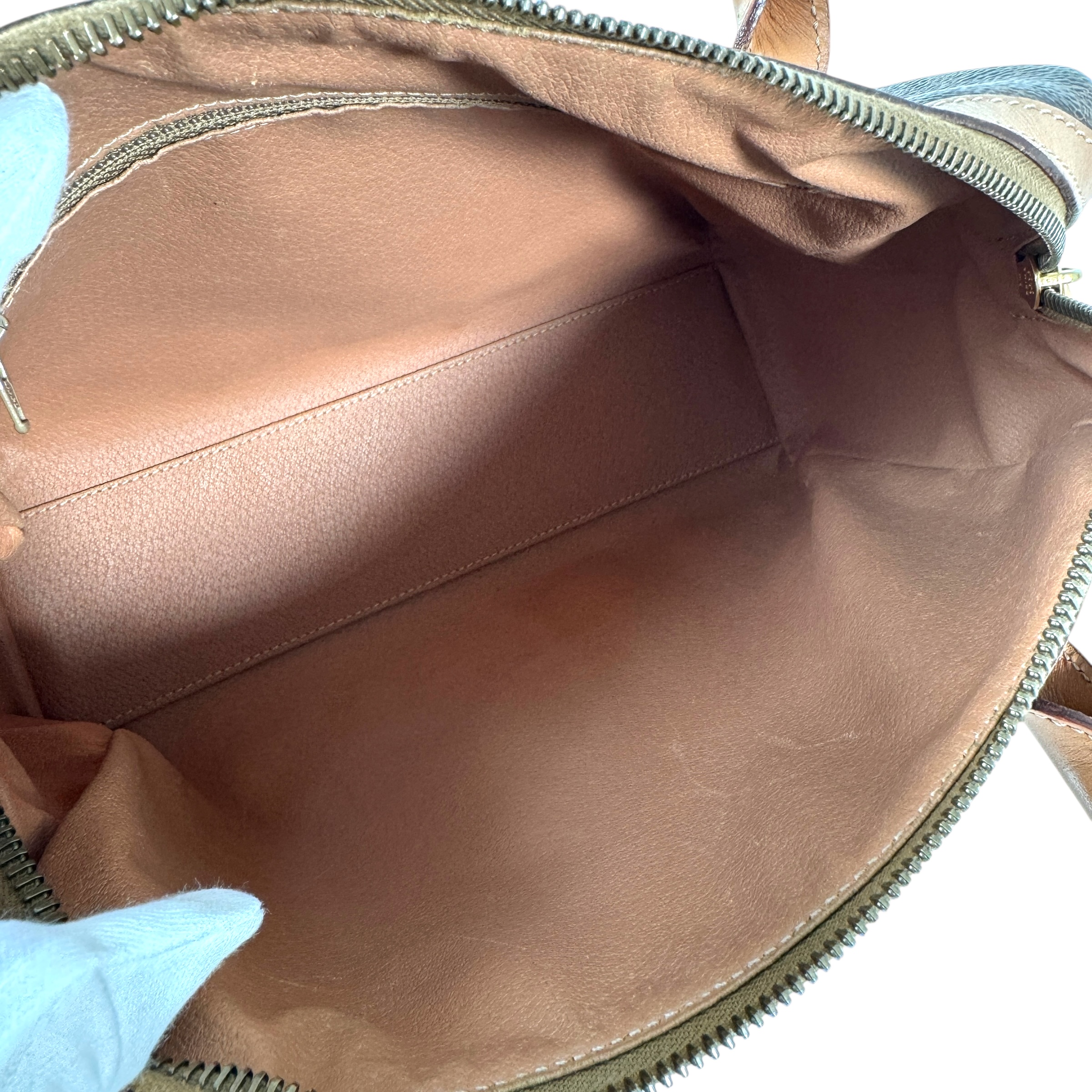 【商品説明】角にスレ、黒ずみ、持ち手に黒ずみ、付け根に極微細なダメージ、内側レザーに擦れ傷がありますが、比較的きれいなお品になります。