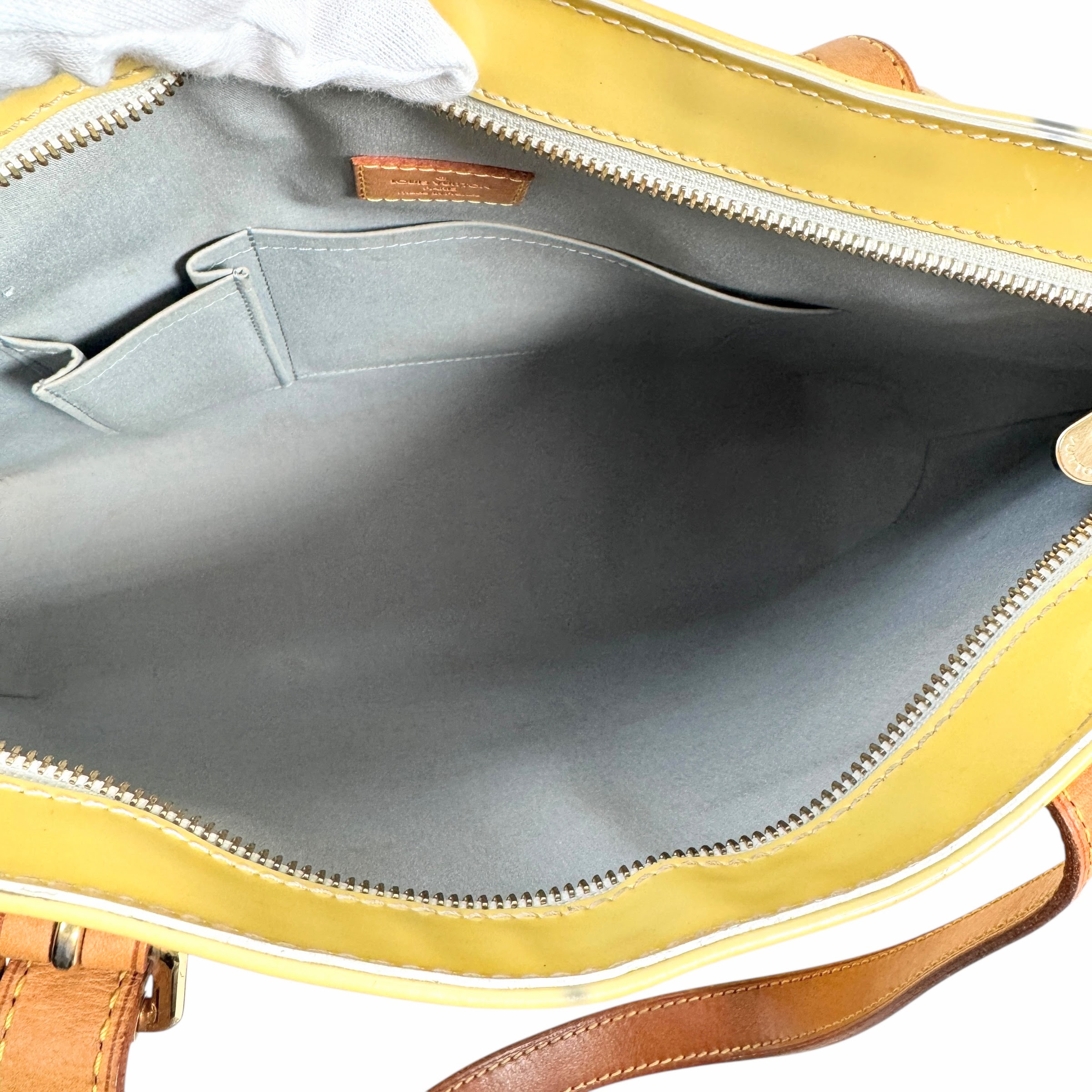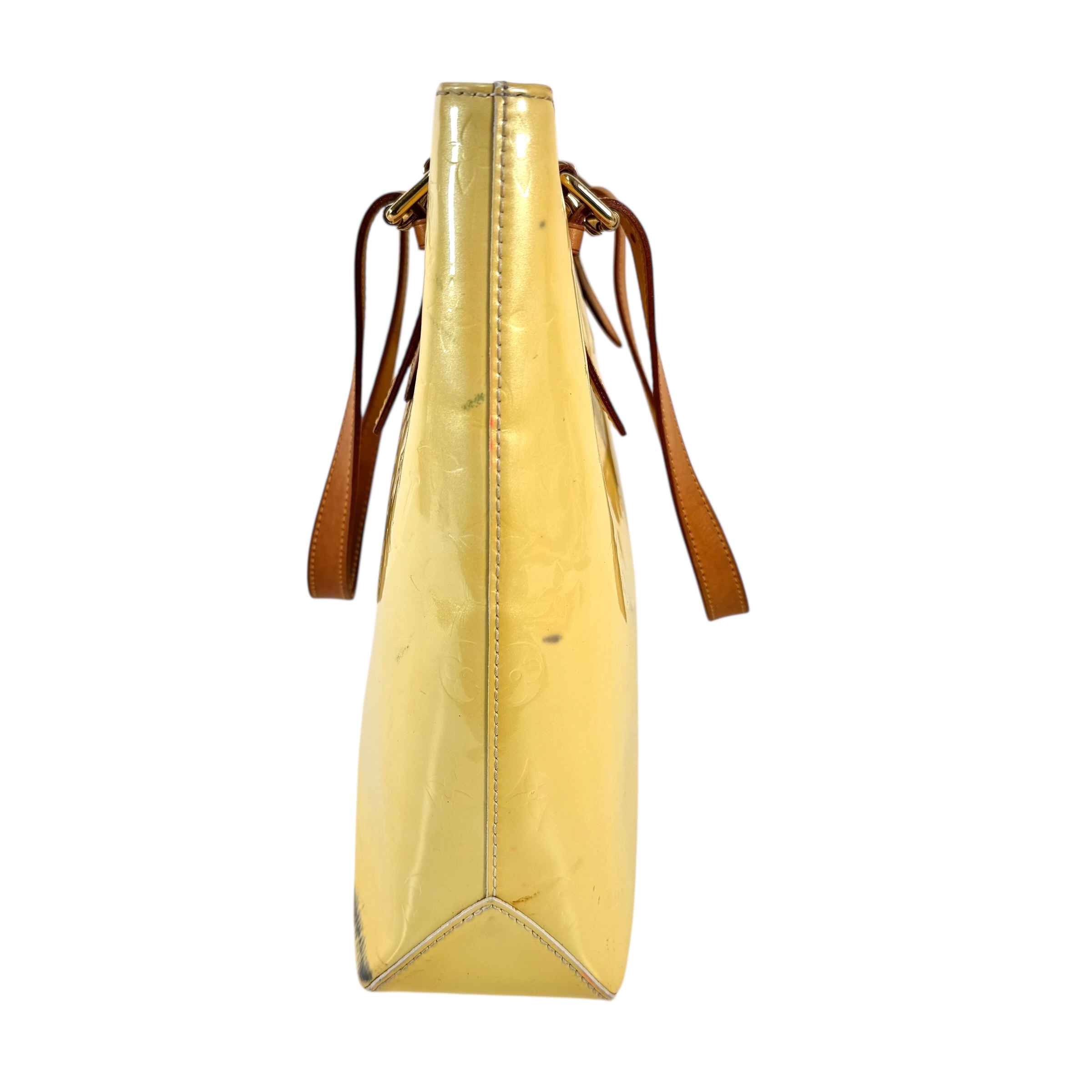 【商品説明】持ち手ヌメ皮にヤケ、黒ずみ、表面にヤケ、ペン汚れ、シミ汚れ、黒ずみがありますが、内側はきれいなお品になります。