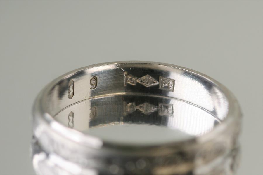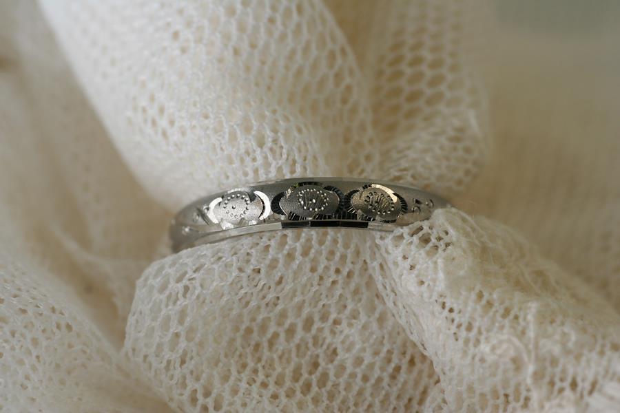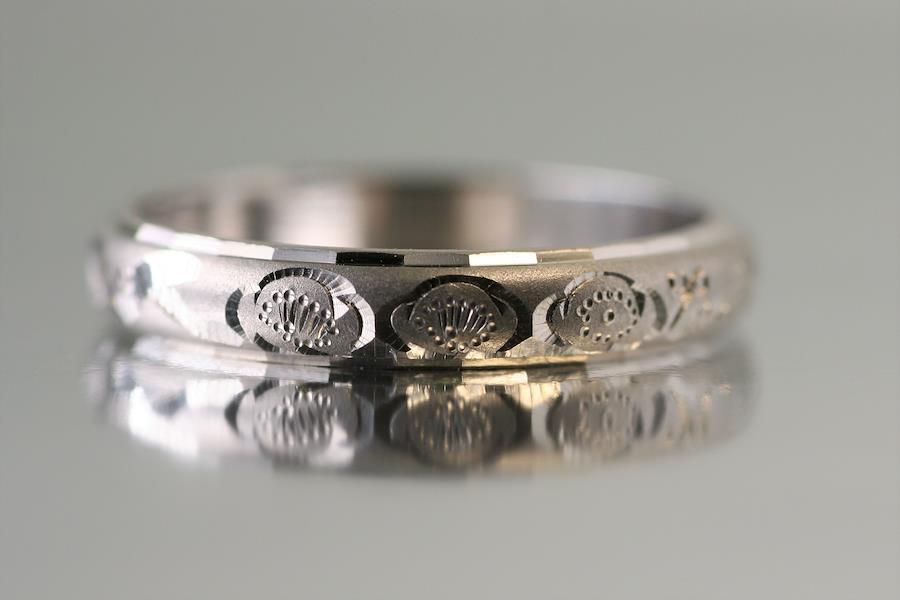 全体に梅の模様を施しています。このリングは、リングのメーカー甲丸リングを購入したものなので、品位検定区分850の政府証明マークがあります。彫り手作業の為全く同じものにはなりませんが、同じ下絵の18金もございます。プラチナは、陽刻で刻印されており、今ではほぼ見ることがない、刻印にもひと手間かけた手作業の証、レトロ感たっぷりのリングです。