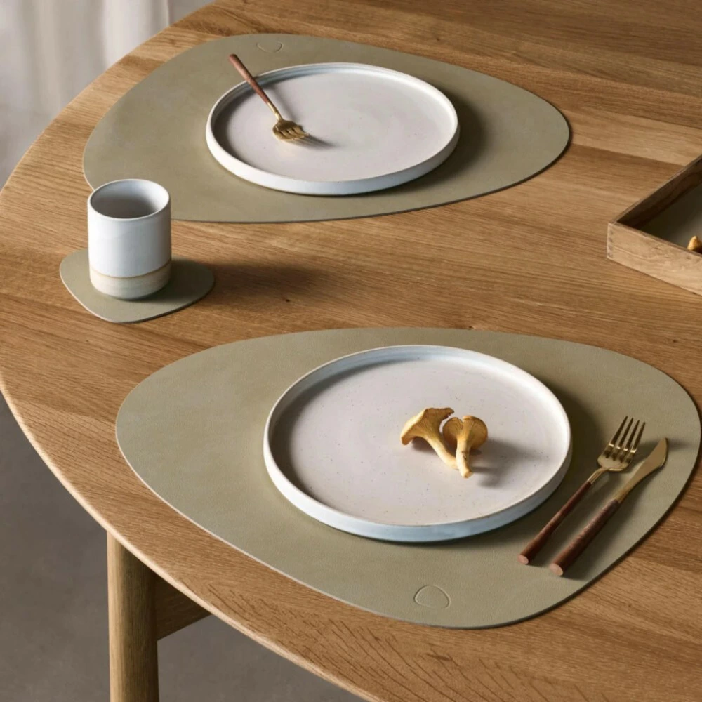 プレイスマット、コースター、フラワーベースカバーはリサイクルレザーを使う事により革の高級感と暮らしの中での使いやすさを両立。