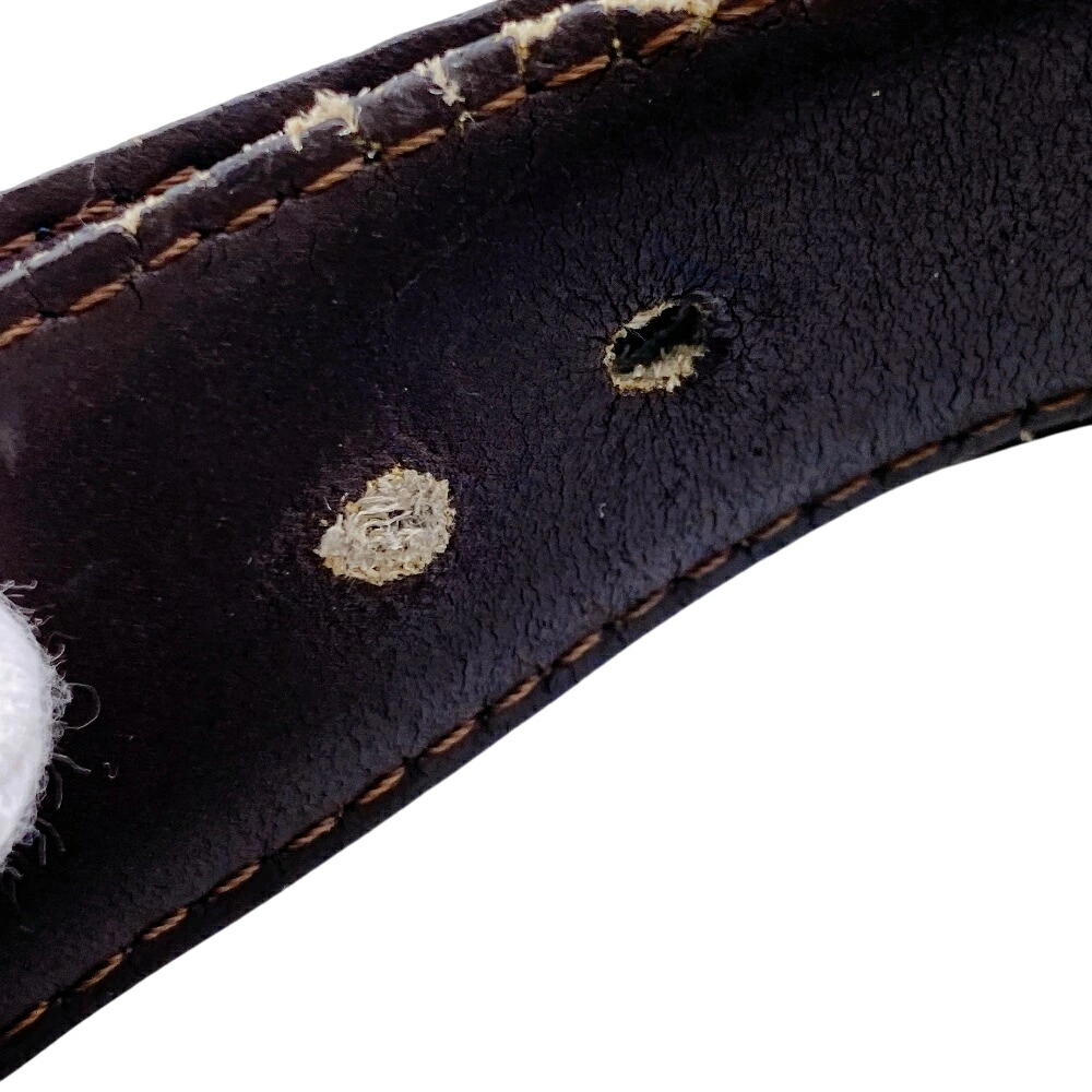 状態 | 【外・表面】スレ、キズ、剥げ、ヨレ、汚れ、シワ、亀裂 【外・コーナー】スレ、キズ、剥がれ、剥げ、破れ、ヨレ、汚れ、コバ割れ、コバ剥がれ、亀裂 【外・形状】やや型崩れ 【内側】スレ , キズ , 汚れ , 凹み , 亀裂 【におい】なし 【金具部分】スレ、キズ、汚れ、くすみ、変色 正規のベルト穴の横にあけられている穴有り。 |