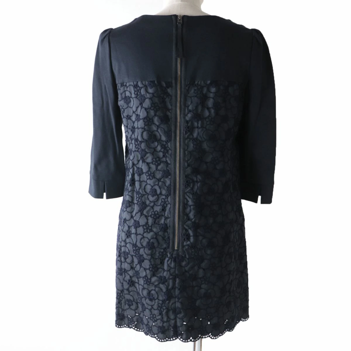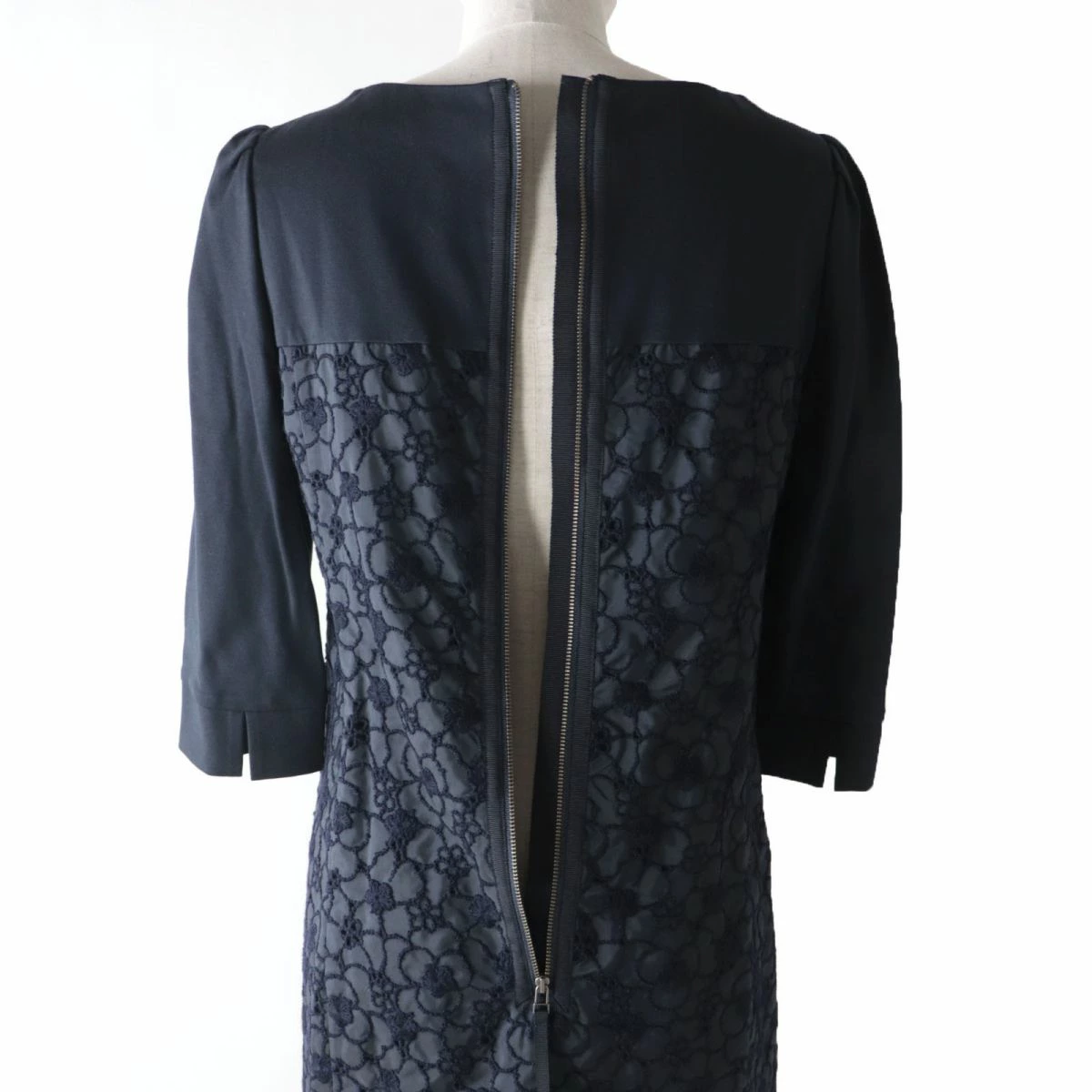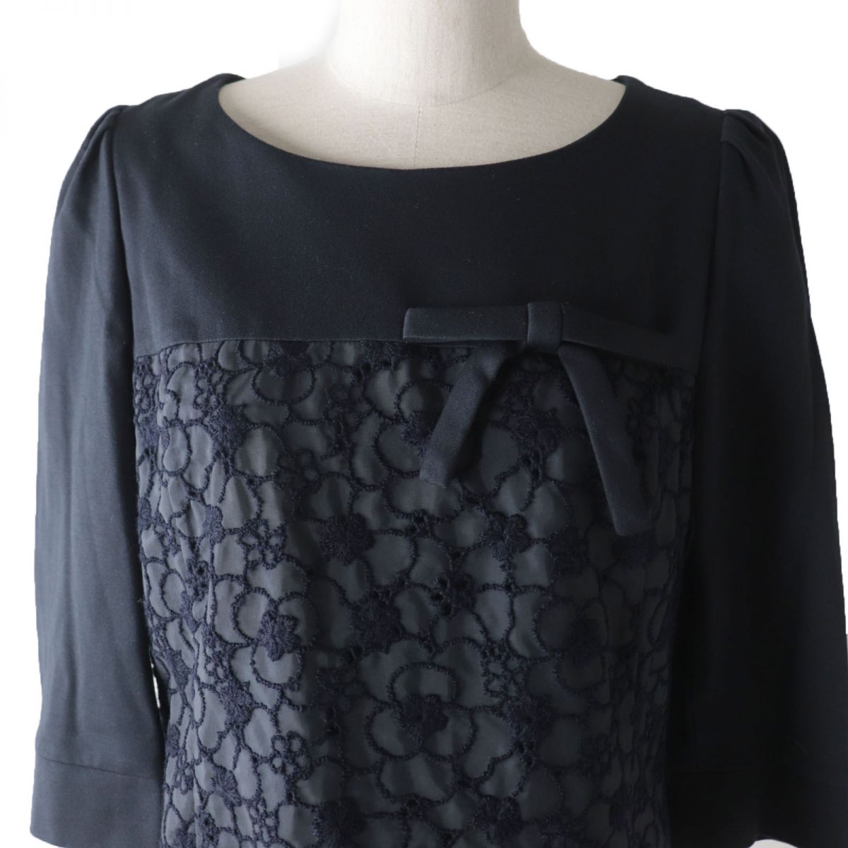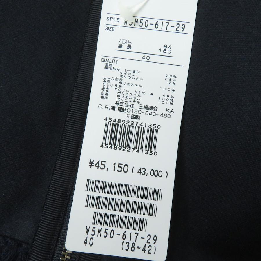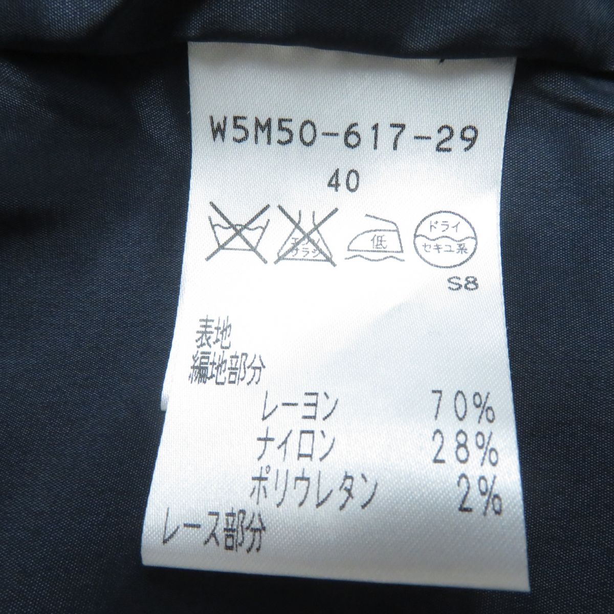 | 素材 (material) | 裏地:ポリエステル 表地(編地部分):レーヨン70% :ナイロン28% :ポリウレタン2% 表地(レース部分・基布)ポリエステル100% ししゅう糸(上糸):アクリル51% :ウール49% ししゅう糸(下糸):ポリエステル100% 別布:ポリエステル100% | ||||||||||||||||