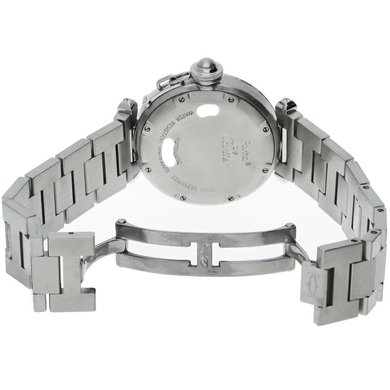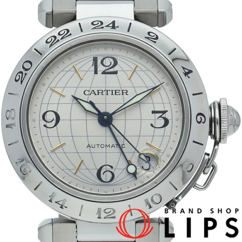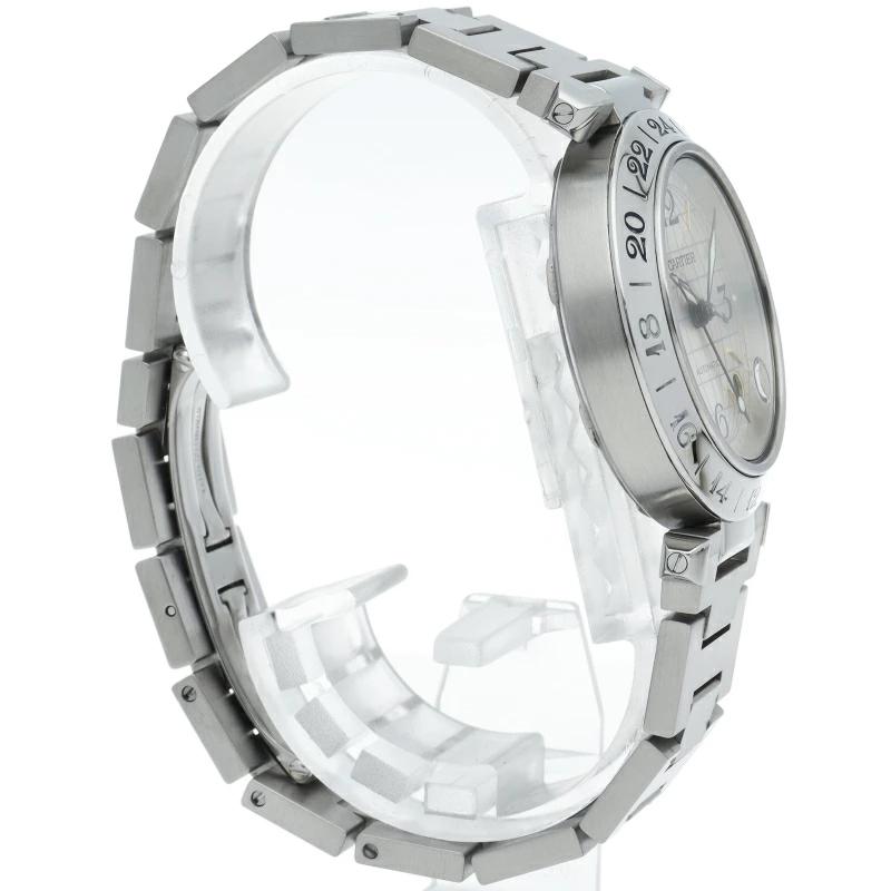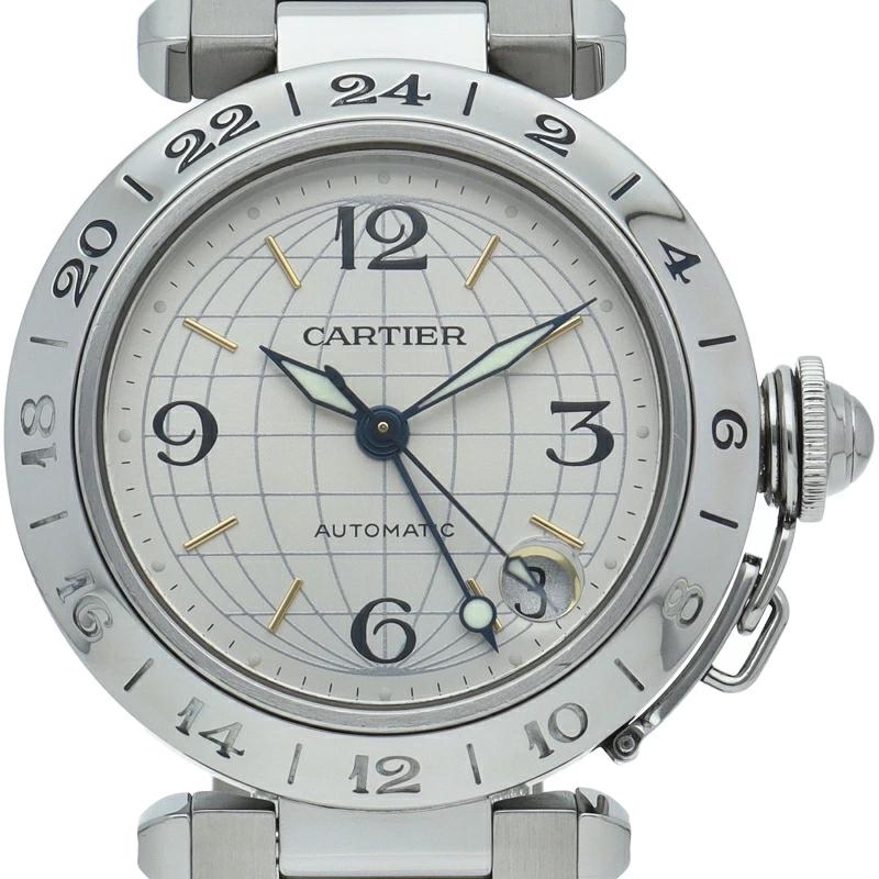 | カルティエの人気「パシャC」シリーズ。文字盤に地球儀をモチーフにした放射線状のデザインを持つ、GMT機能搭載モデル。 |