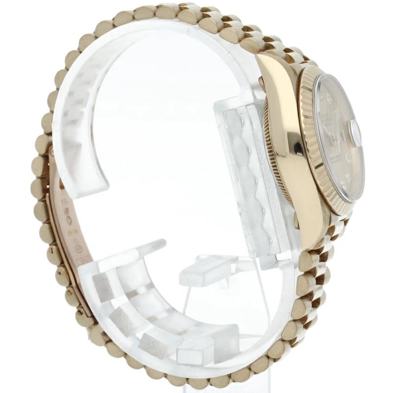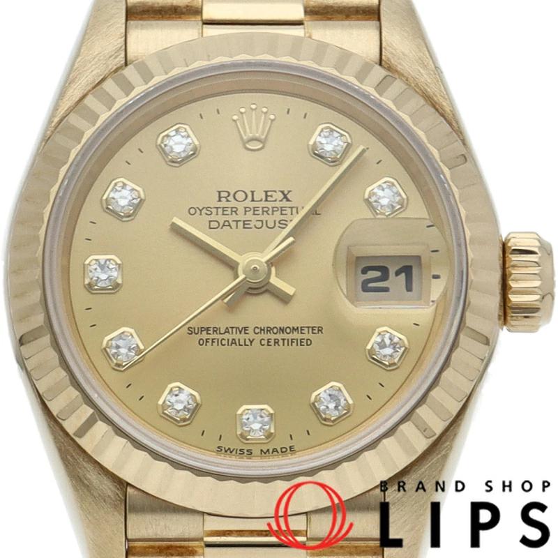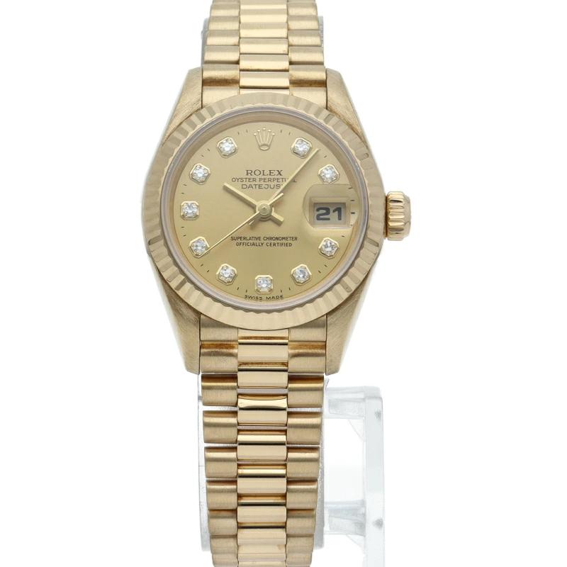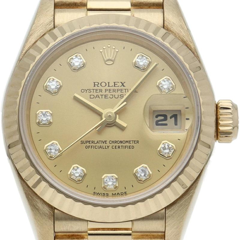 | ロレックスのドレスウォッチで幅広い年齢層に愛されているデイトジャスト。イエローゴールドのケース、シャンパン文字盤に10Pダイヤが施され豪華です。 |