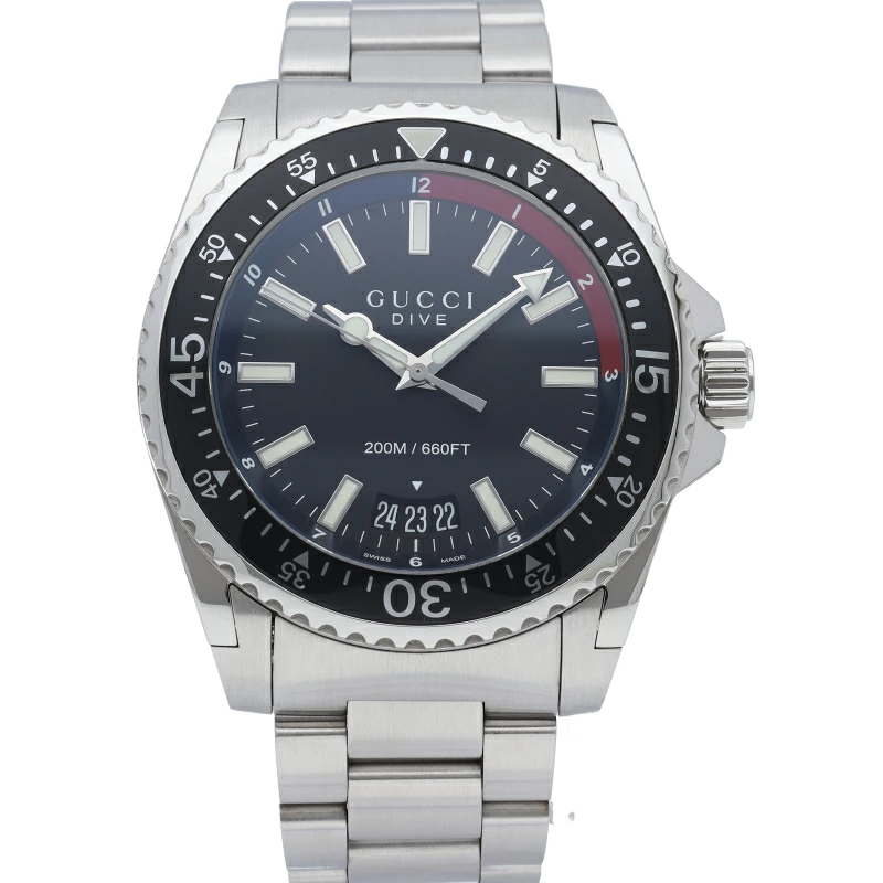 | ブラックの逆回転防止ベゼルとダイヤルの間にダイビングスケール目盛りが直感的に読み取れるようレッド×ブルーを配した厚さ12ミリの45ミリ200m防水大ぶりケース&3連ブレス重さ195グラムのずっしりとした着け心地もたまらないダイブ。6時のワイド窓に日付を表示し、シルバー指針と太いバーインデックスには蛍光塗料が塗布されて暗所でも視認性を発揮します。136.2/Y136212。 |