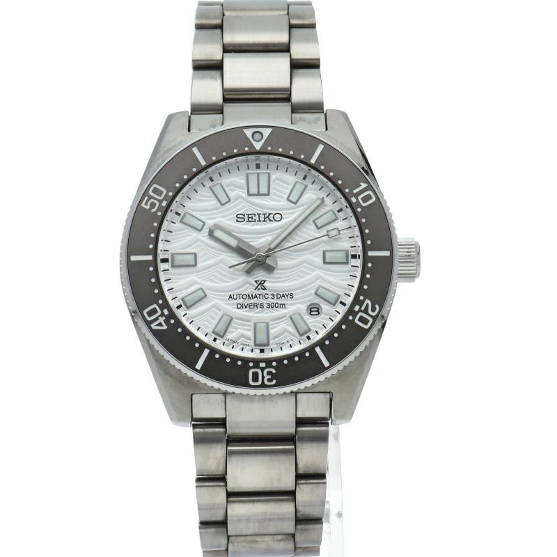 | 荒々しい海の情景を表現した、ダイヤルの「ウェーブマーク」が特徴の限定モデル。1965年に発表されたセイコー初のダイバーズウオッチを基にアップデートしたデザインです。ダイヤルカラーにシルバーを、ベゼルの表示板には洗練されたグレーを採用し、ケースとの調和がとれた一体感のあるデザインが高級感を引き立てています。SBDC213/6R55-00K0 |