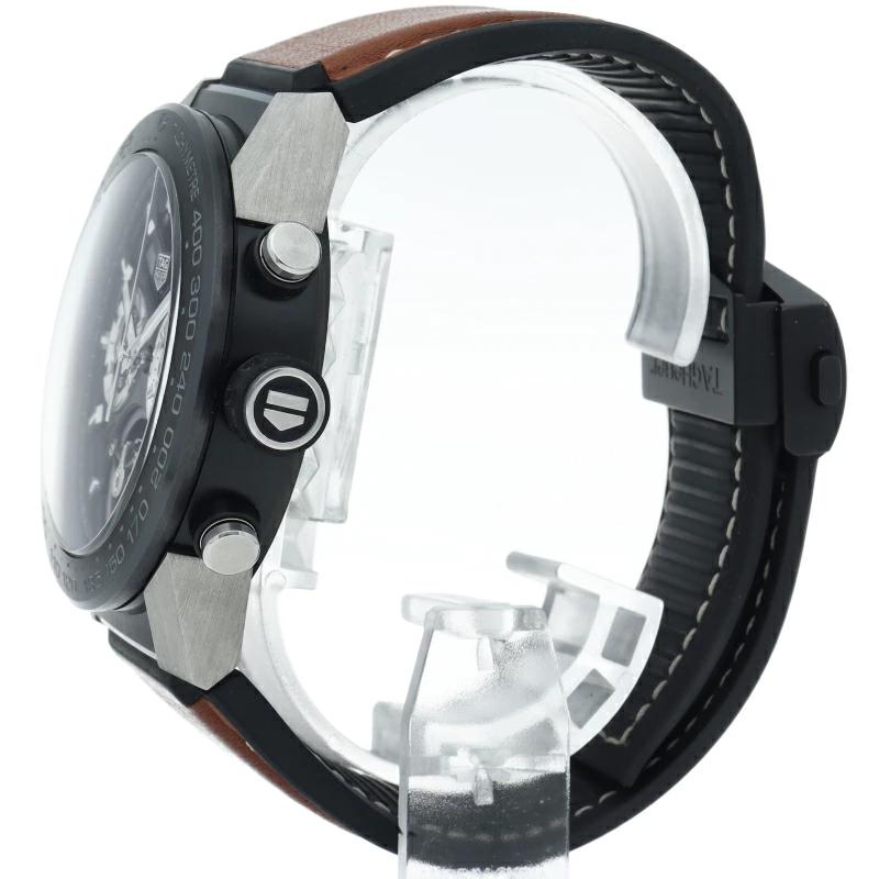 | フラッグシップモデル「タグ・ホイヤー カレラ ホイヤー02 トゥールビヨン クロノグラフ」のオールセラミック エディション。シルバートーンのダイヤル、8時位置と9時位置との間にプリントされた大胆なレッドの“CHRONOMETER”の文字が、オールブラックのデザインのアクセントになっています。 |