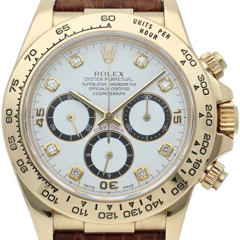 | ゼニス社の世界最高峰ムーブメント「エルプリメロ」を搭載したロレックスのスポーツモデルの最上級モデル「デイトナ」。イエローゴールドケースに8Pダイヤが施されたワンランク上の1本。 |
