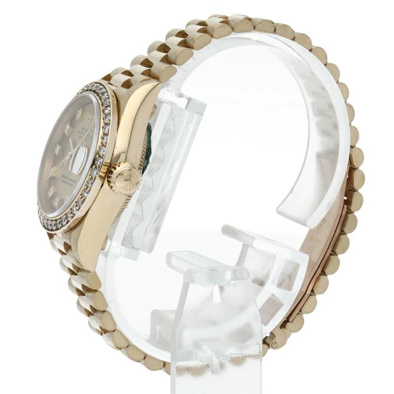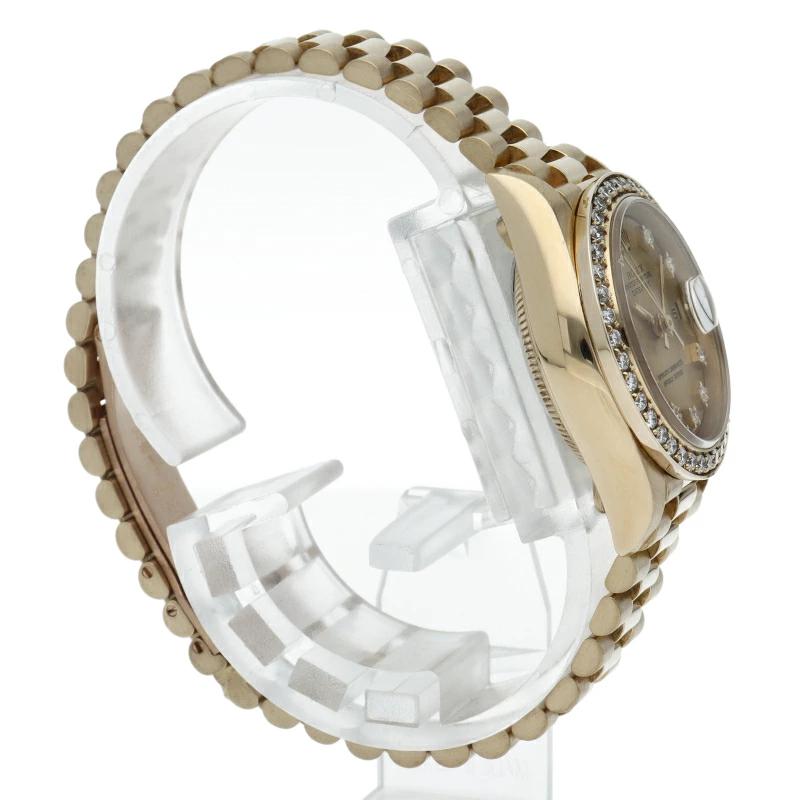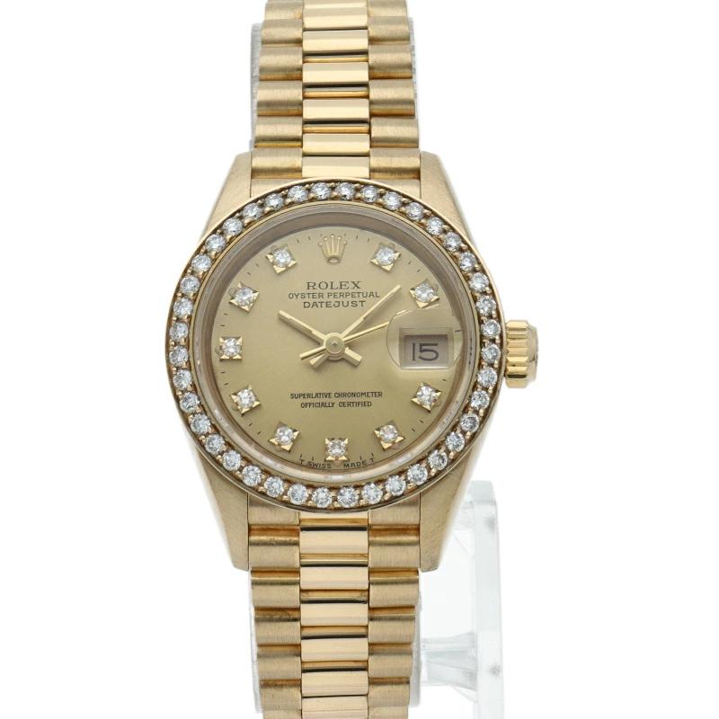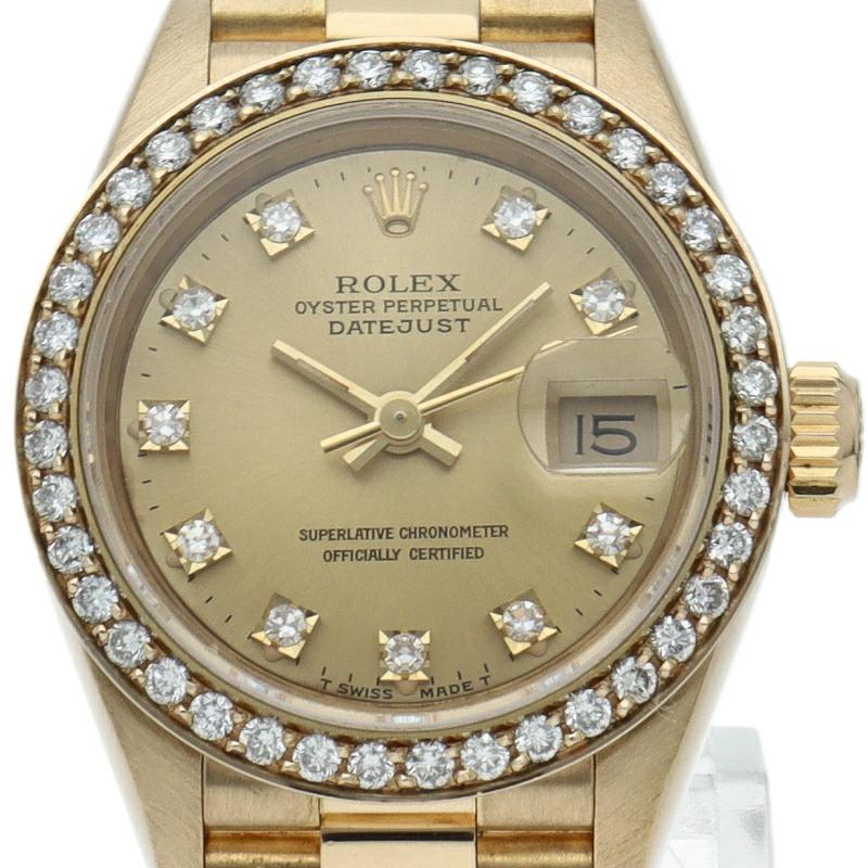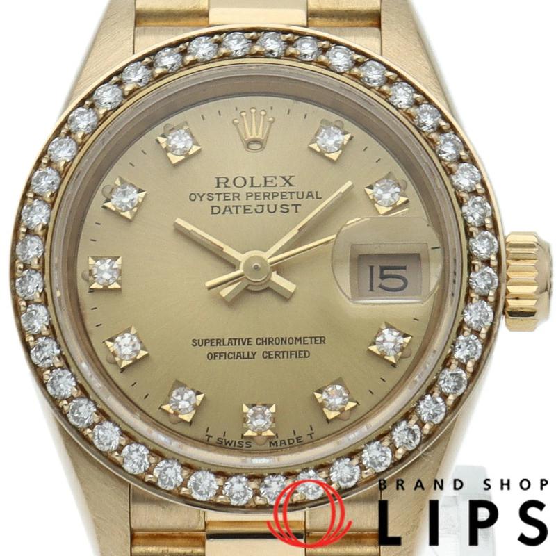 | ロレックスのドレスウォッチで幅広い年齢層に愛されているデイトジャスト。イエローゴールドのケース、シャンパン文字盤に10Pダイヤが施され豪華です。 |
