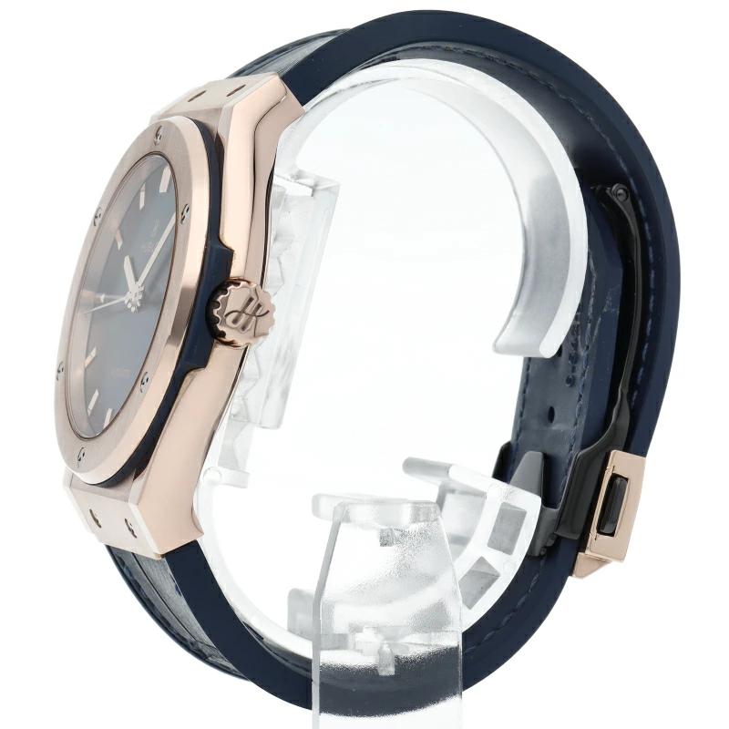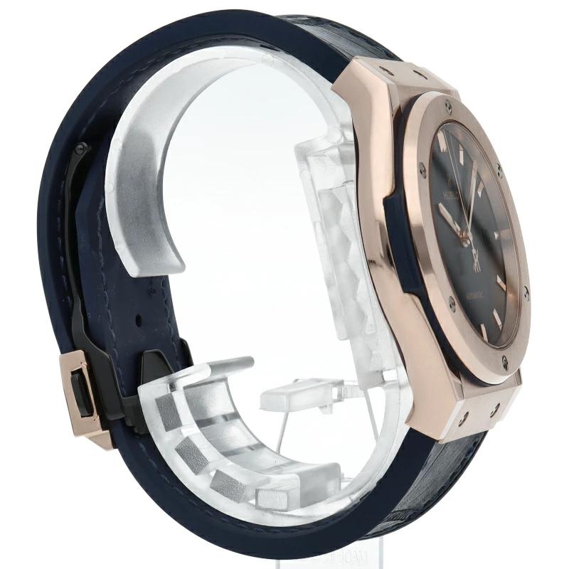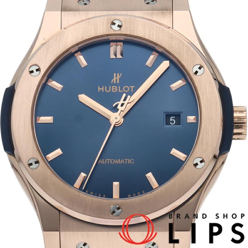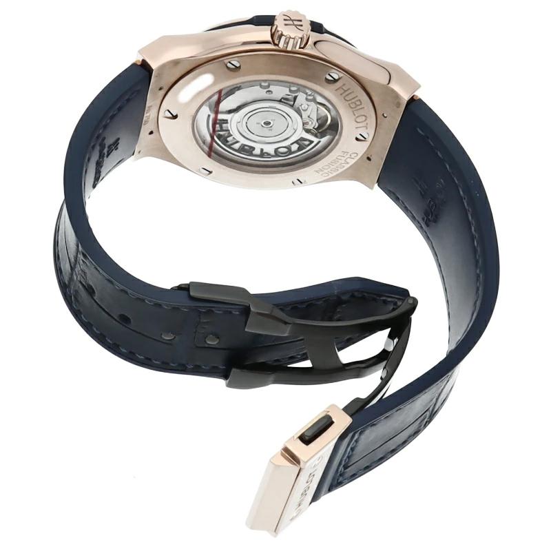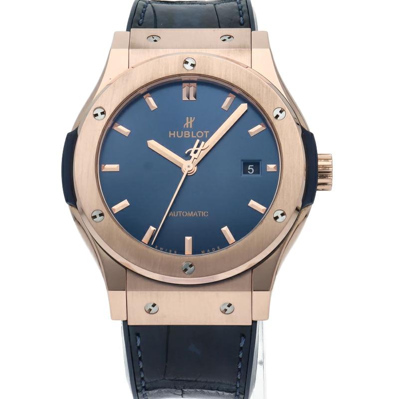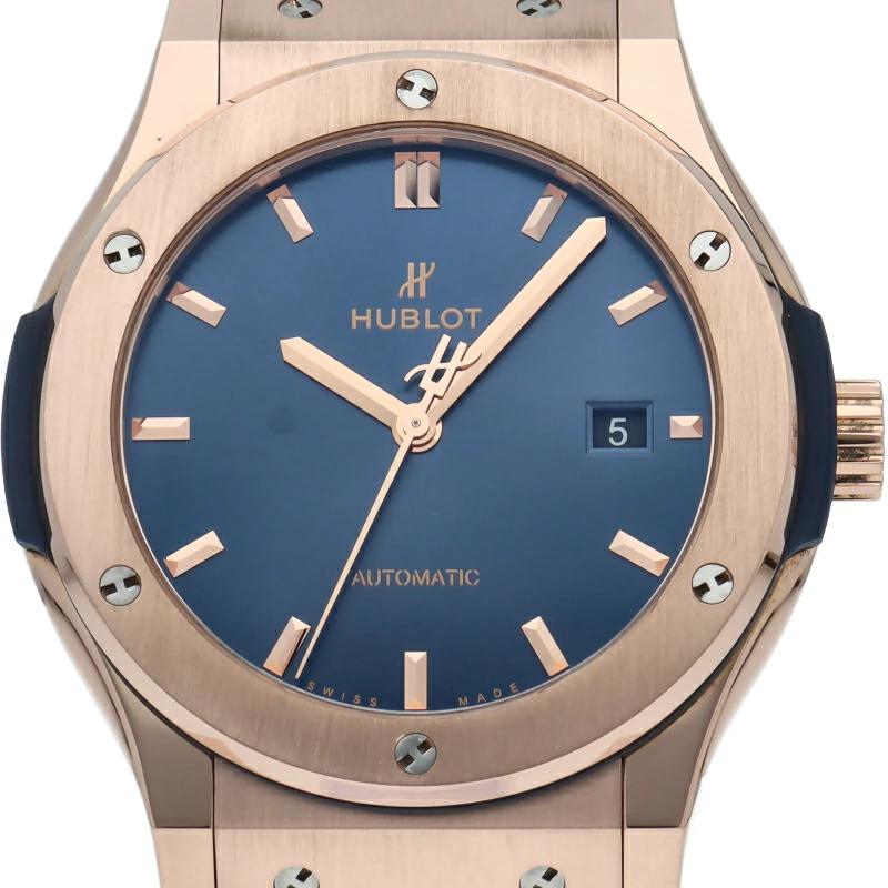 ウブロが独自に開発した「キングゴールド」をケースに採用したクラシックフュージョン。自動巻きムーブメント“HUB1143”搭載モデルで約42時間のパワーリザーブがあります。