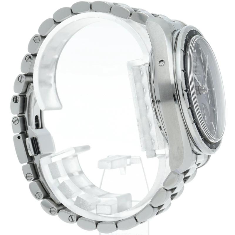 | このモデルの特徴は、ステンレススティール製ケースと、ブラックのアルミニウム製リングにタキメータースケールを搭載したベゼルです。サンブラッシュ仕上げのグレーのダイアルには横楕円型のサブダイアルを、6時位置には縦楕円型の日付窓を配しました。針とインデックスはロジウム仕上げです。オメガ コーアクシャル キャリバー3330搭載。 |