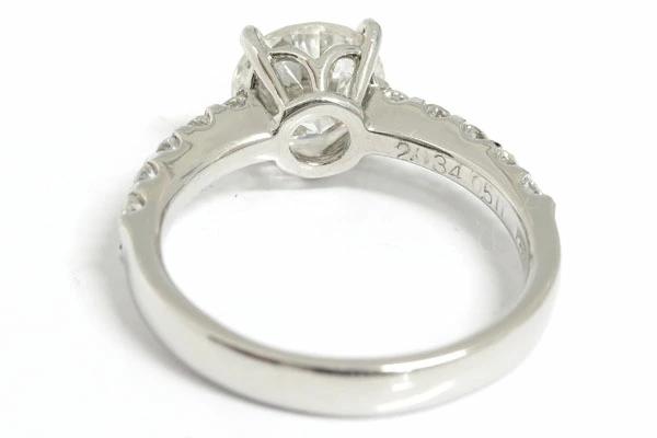 | コメント | トップに2ctオーバーの大きい一粒ダイヤモンドと、その両サイドのリングに5Pずつ計10Pの小粒ダイヤモンドがレイアウトされ、真上から見える範囲内ではすべてがダイヤモンドという豪勢なリングです。横から見てもダイヤモンドが厚く、贅沢の一言に尽きます。 |