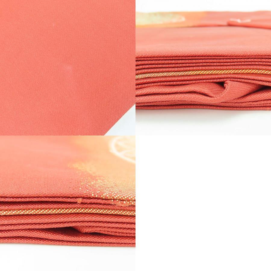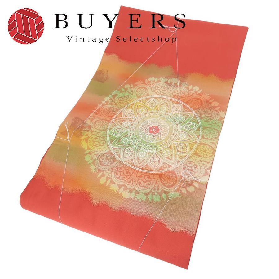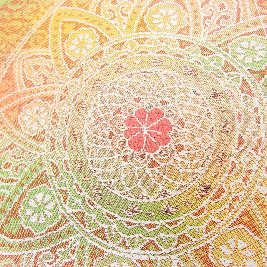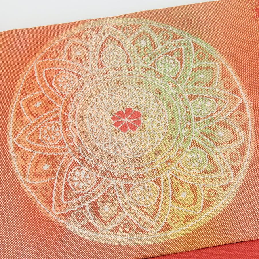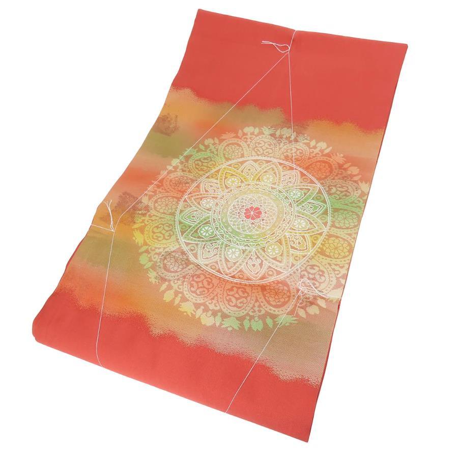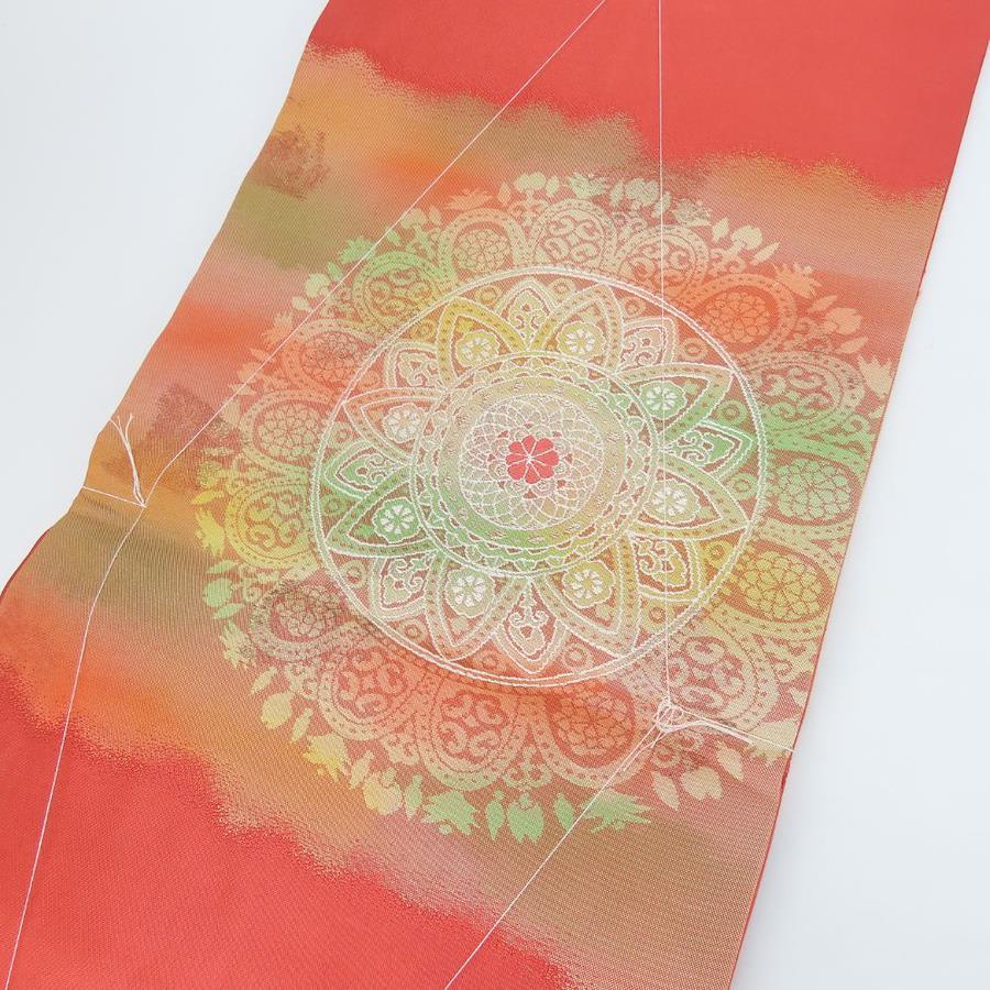 品名【中古】 名古屋帯 しつけ糸あり 九寸 正絹(金銀糸除く) 金糸 ピンク系 オレンジ系 マルチカラー 名古屋仕立て モダン お洒落 レディース 女性