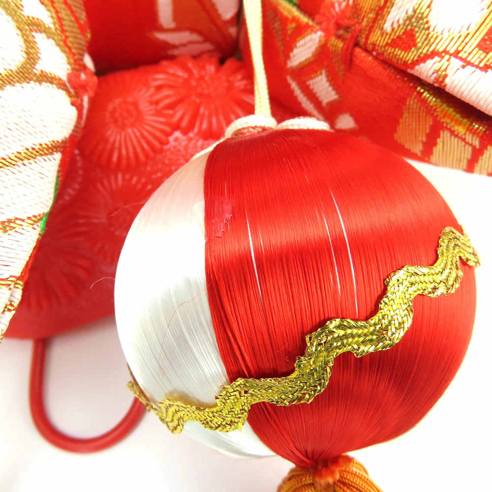 結び部分:鈴に多少の錆、鞠に若干の糊汚れ、紐に若干の黄ばみ・シワ、切りっぱなし部分端若干のほつれ