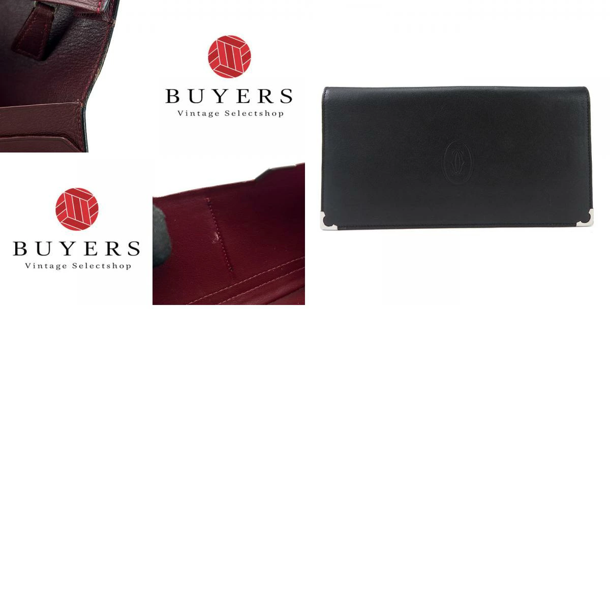 Pre-owned Cartier bi-fold long wallet with cabochon lines, black leather, and silver hardware. Perfect for everyday use. Men's and women's accessories.