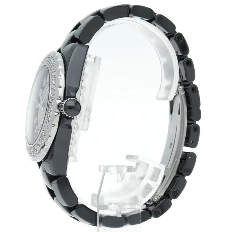 | シャネルの人気フラッグシップウォッチで「J12」。異素材で傷がつきにくく独特な光沢感をもつセラミックを使用、文字盤とベゼルにはパヴェダイヤがギッシリ施された高級感ある1本。 |