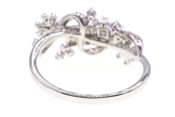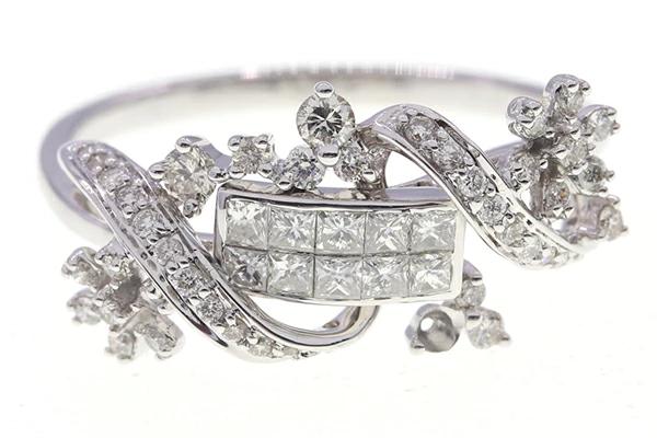 ラウンドブリリアントカットダイヤとプリンセスカットダイヤがセッティングされています。ラウンドカットダイヤはおおよそSI〜Iクラスで、ややブラウンがかっています。