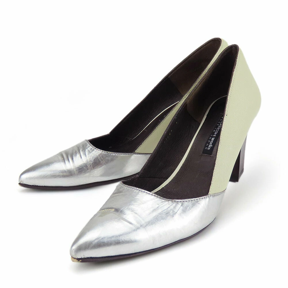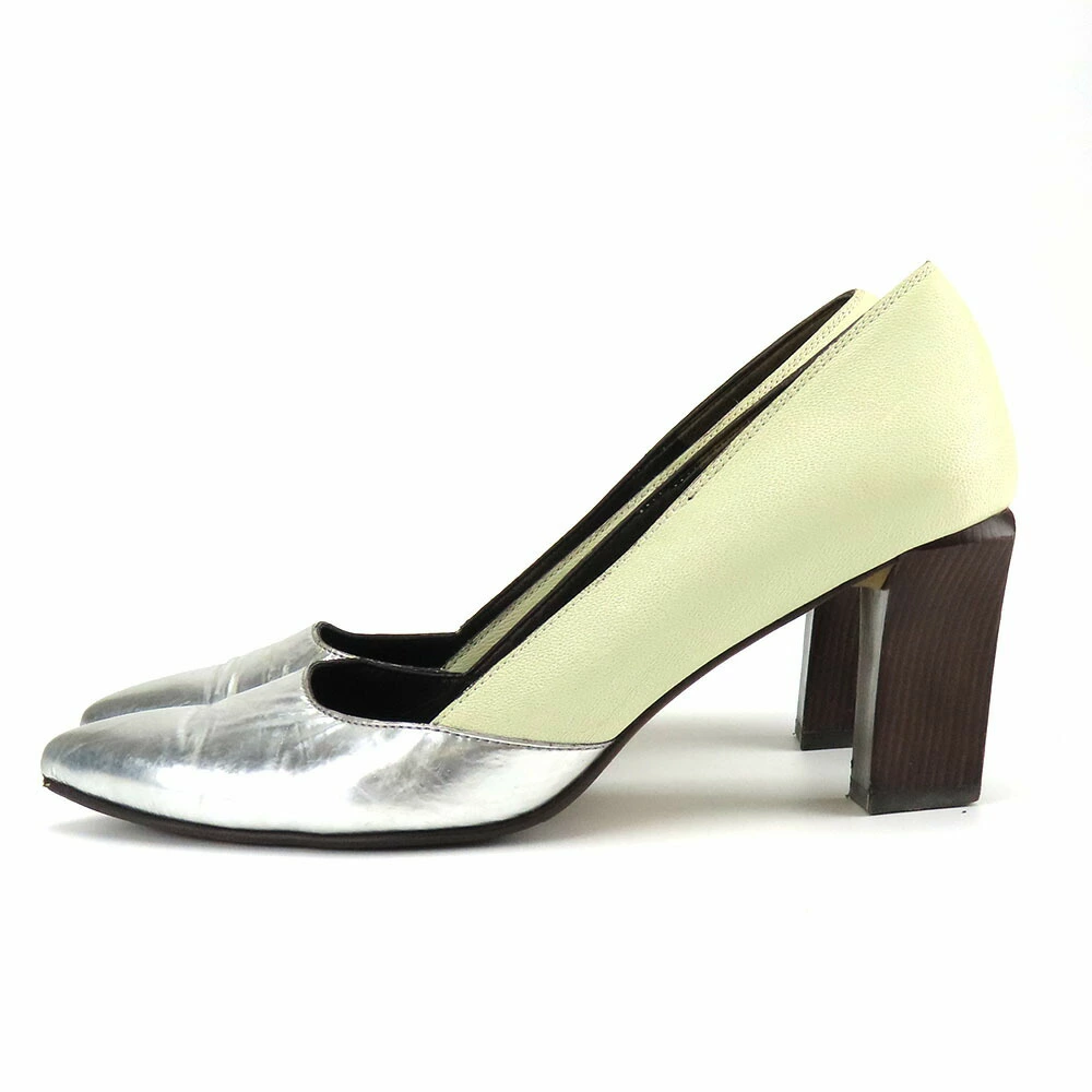 Pre-owned RABOKIGOSHI Works pumps, size 24 1/2, leather, silver and light green, JP size approximately 24.5cm, heel approximately 7.5cm, women's shoes.