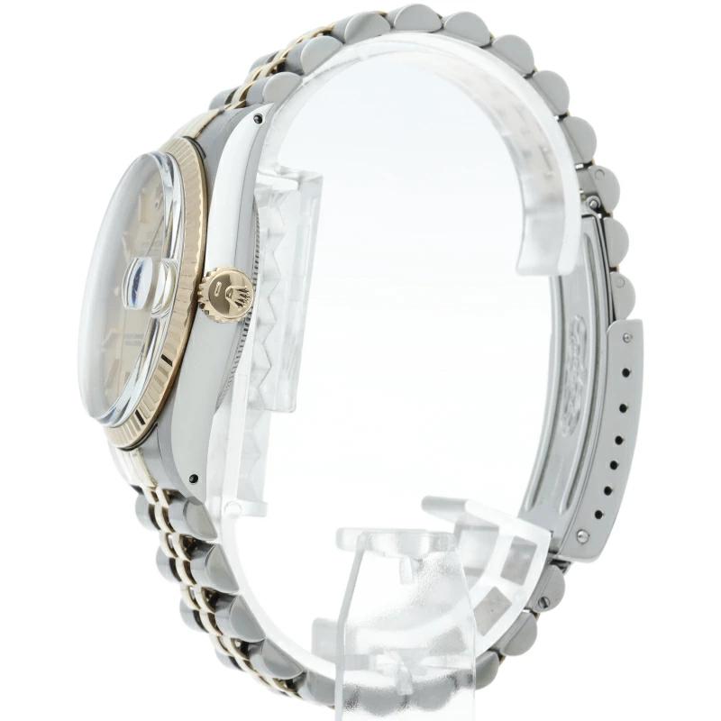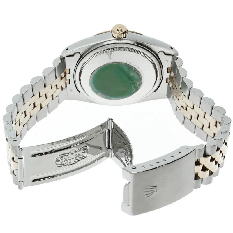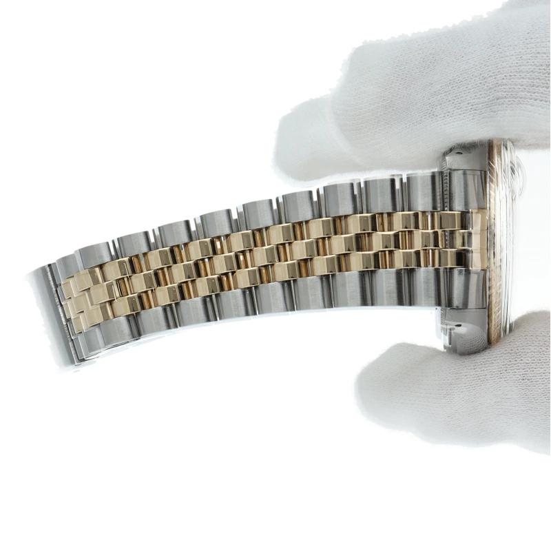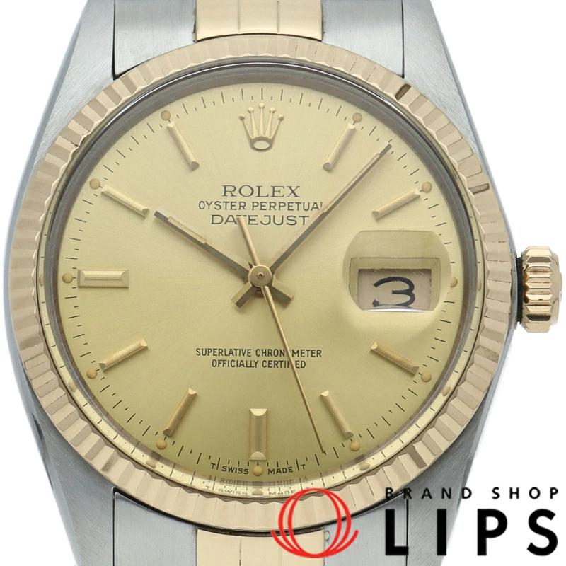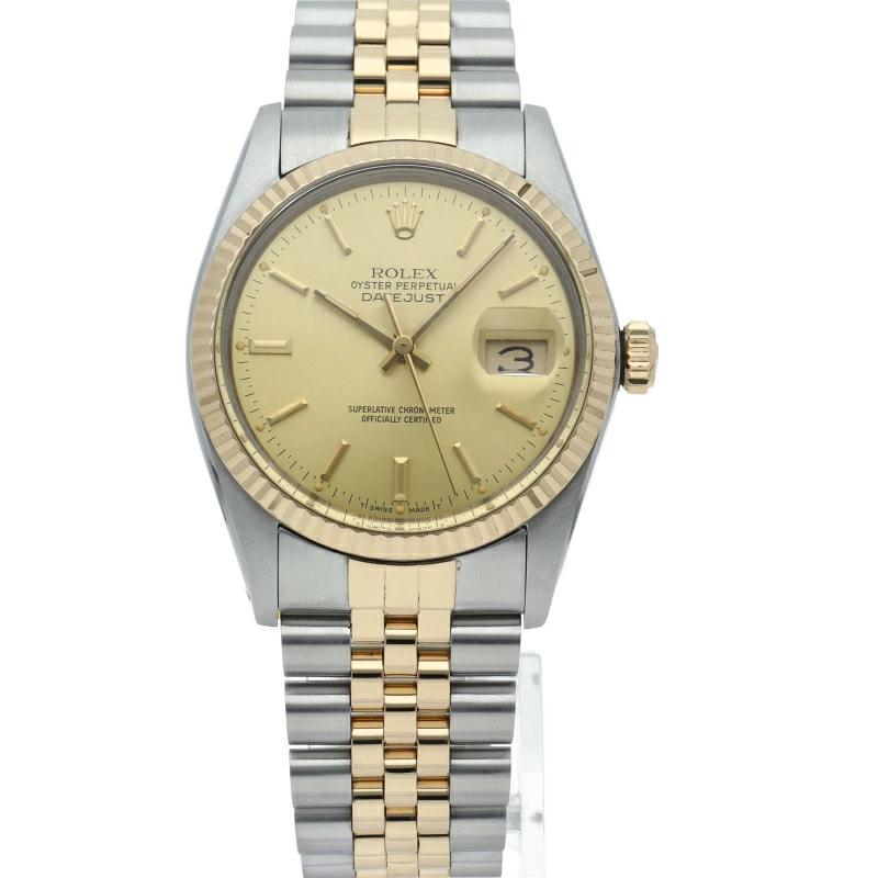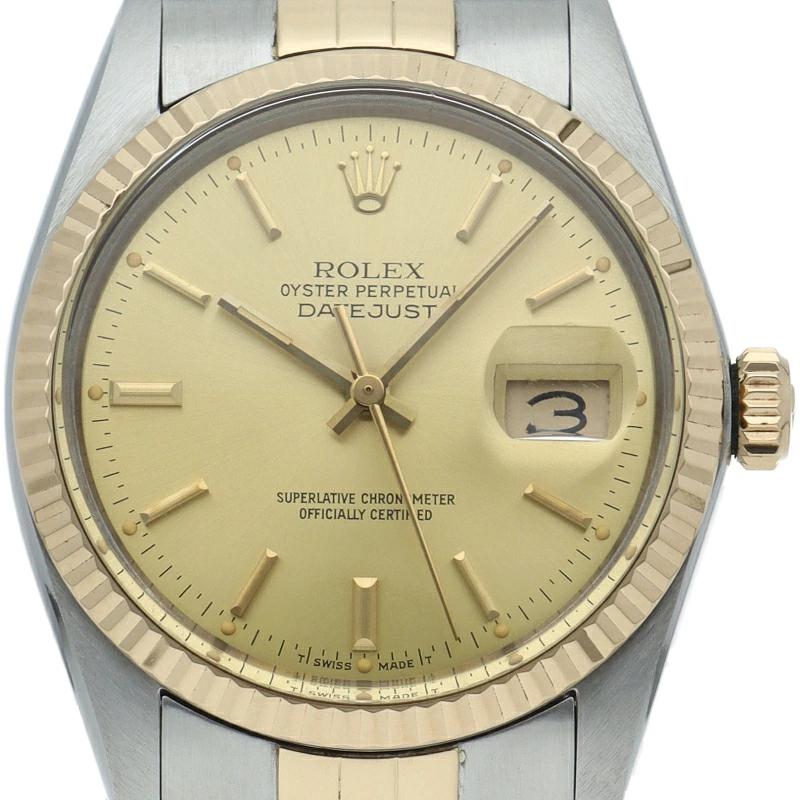 | ロレックスドレスウォッチの王道「デイトジャスト」。イエローゴールドとステンレスの組み合わせが高級感を感じさせる1本です。プラスチック風防仕様。 |