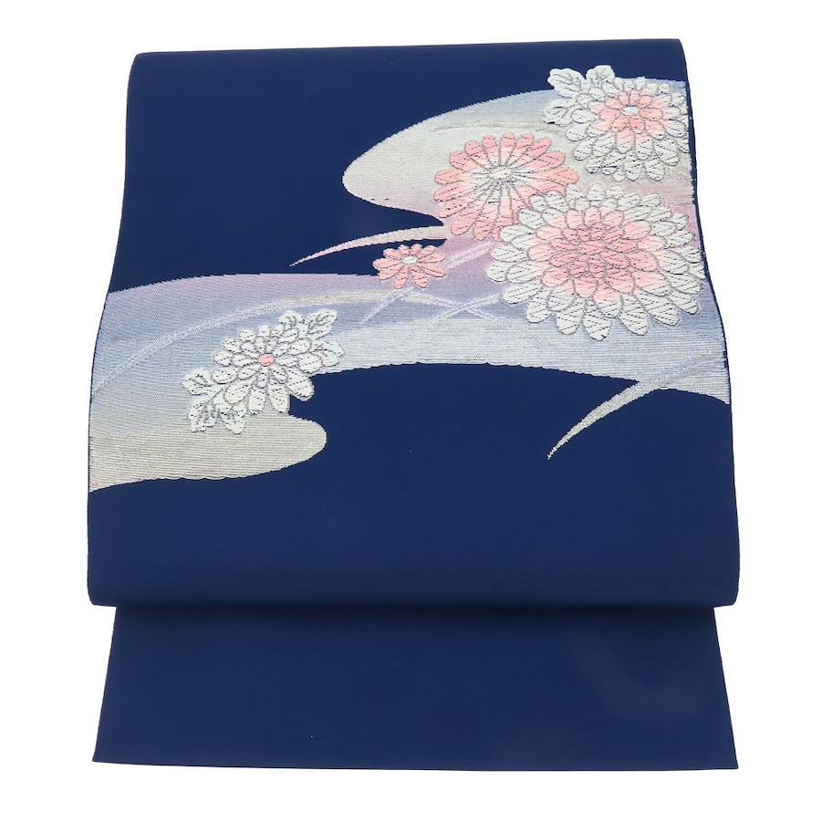 品名【中古】 名古屋帯 八寸 化学繊維 ネイビー ピンク系 シルバー 松葉仕立て 流水に花 レディース 女性