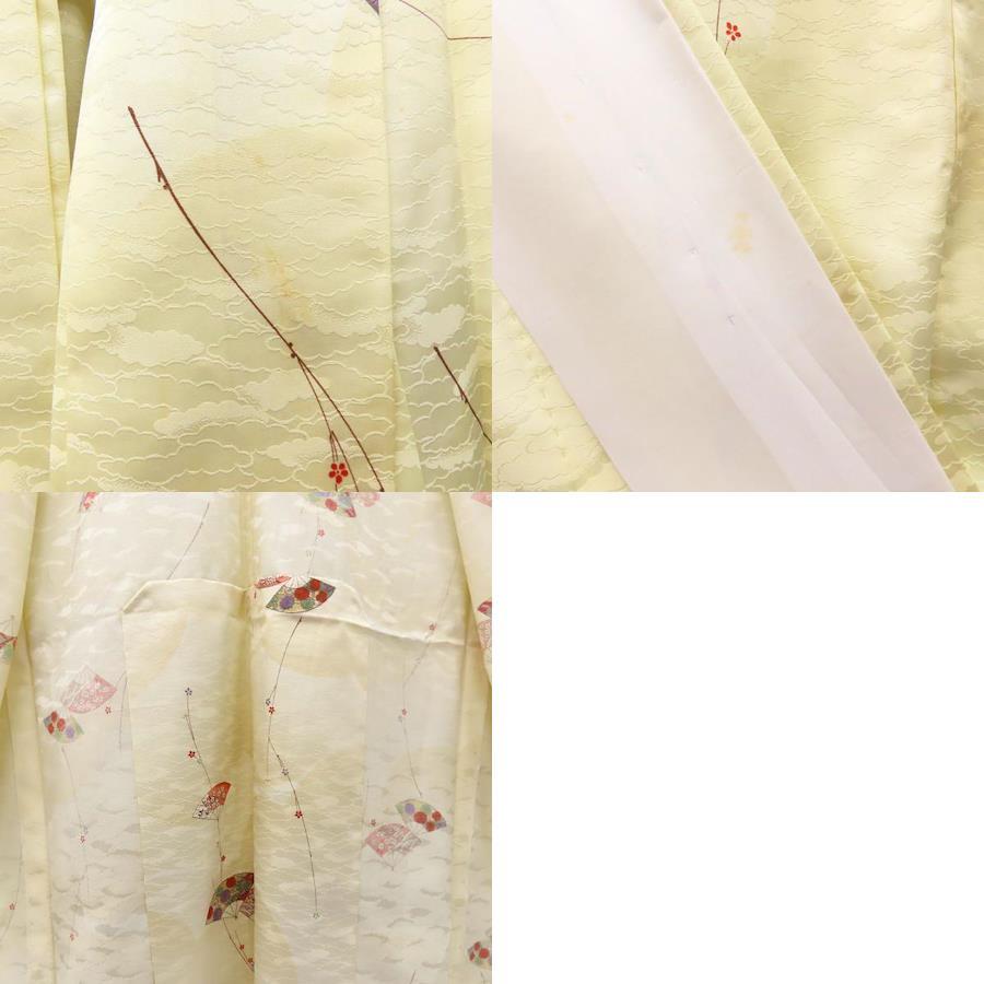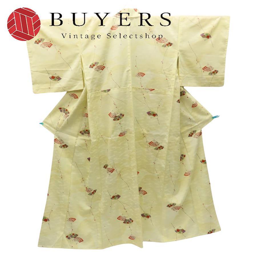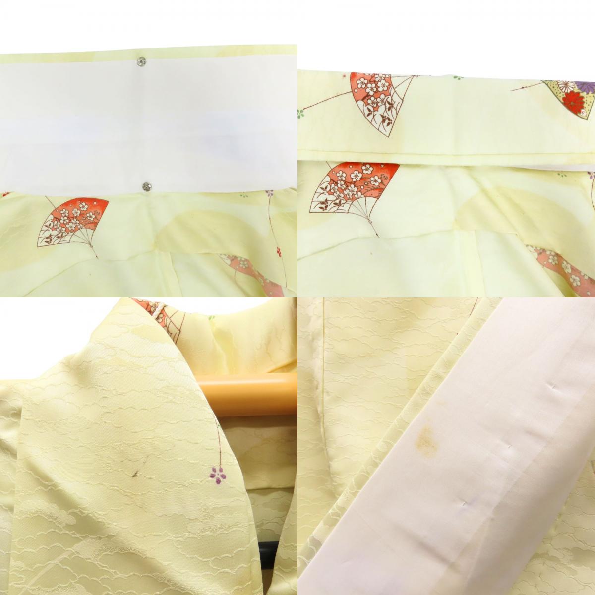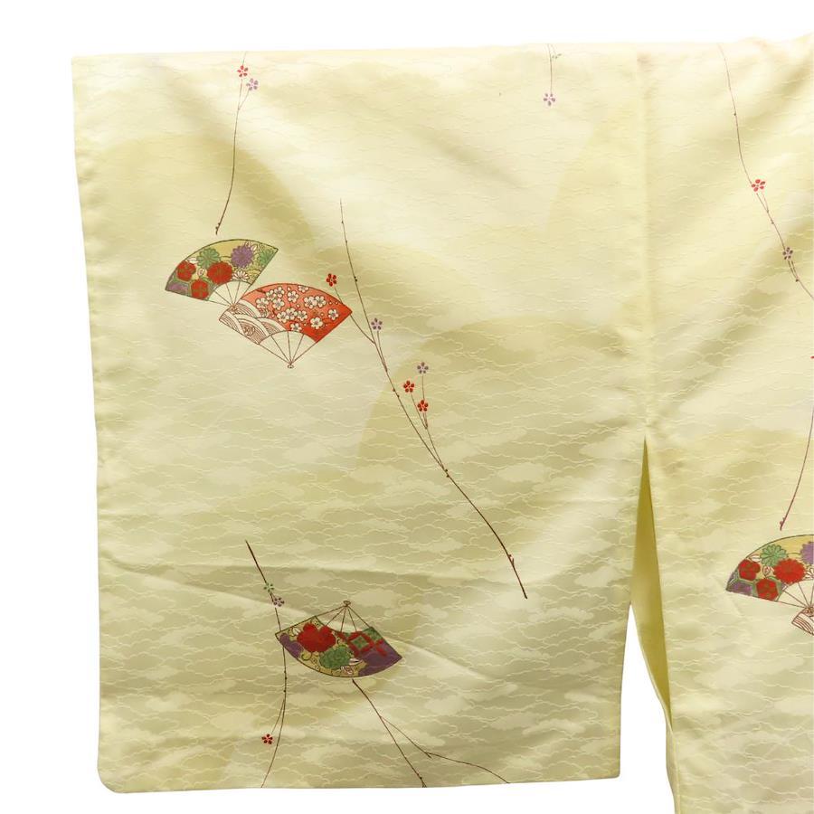 [Pre-owned] Small Pattern Kimono, Synthetic Fiber, Pastel Yellow, Multicolor, Fan Pattern, Japanese Kimono, Women's