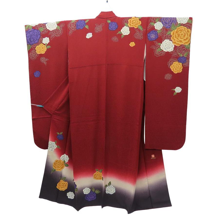 Pre-owned Kimono Set: Furisode, Undergarment, Layered Collar, and Fake Collar. Authentic Silk (Gold and Silver Threads Excluded). Crimson. Artist-Made. Kimono for Women.