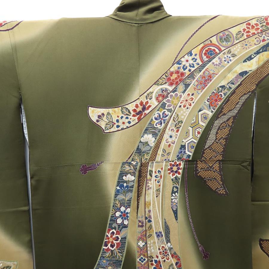 Pre-owned furisode kimono, pure silk, khaki, beige, purple, and multicolor, perfect for coming-of-age ceremonies, featuring a classic pattern. Perfect for traditional Japanese clothing, this kimono is perfect for women.