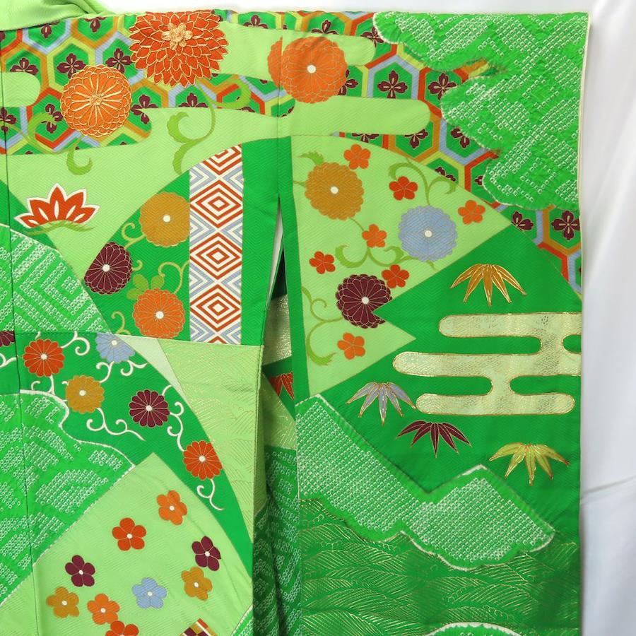 Pre-owned Kimono with Gold Embroidery, Pure Silk (excluding gold and silver threads), Green and Multicolor, Coming-of-Age Ceremony Kimono, Women's
