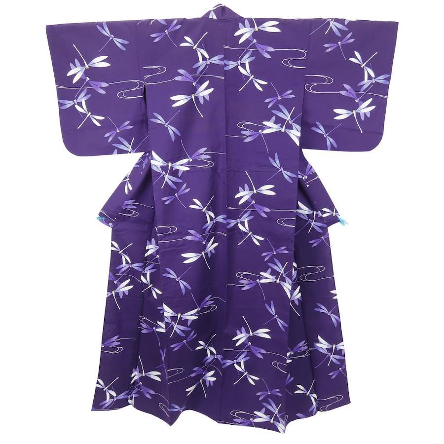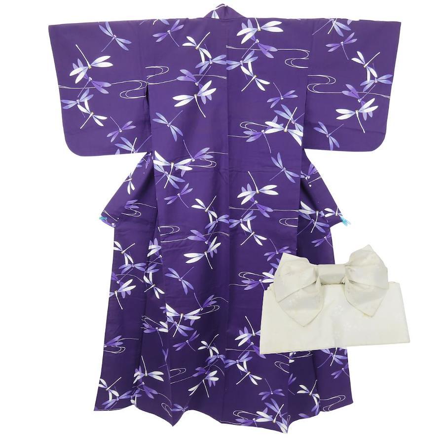 [Used] Yukata Set with Pre-Obi, Cotton and Polyester, Purple and White, Half-Width Obi, Ribbon, Cute, Kimono, Women's