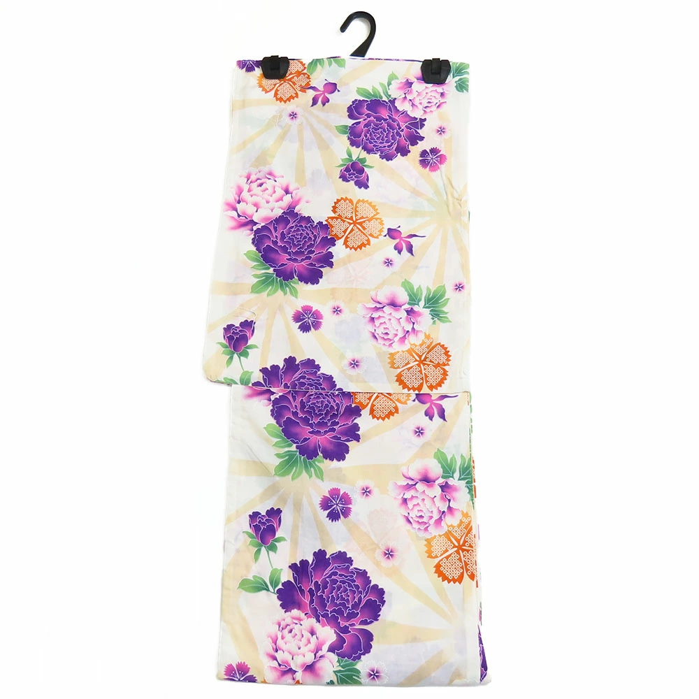 Pre-owned, unused display yukata (casual, beige, purple, multicolored cotton kimono with peonies and goldfish motifs). A sophisticated and cute piece for women.