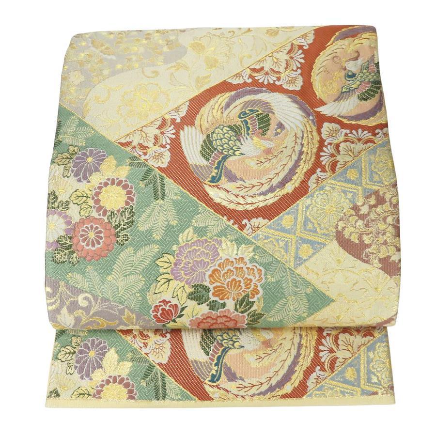 品名【中古】 袋帯 六通柄 吉祥文様 正絹(金銀糸除く) 金糸 ゴールド系 マルチカラー フォーマル 花唐草 日本伝統模様 レディース 女性
