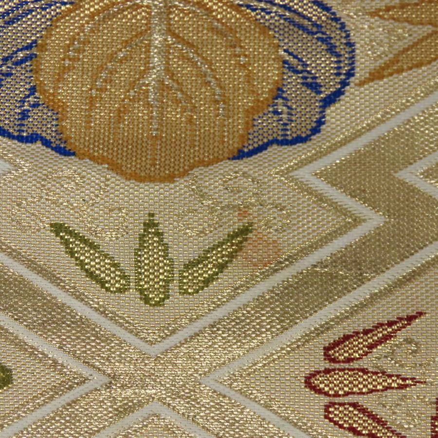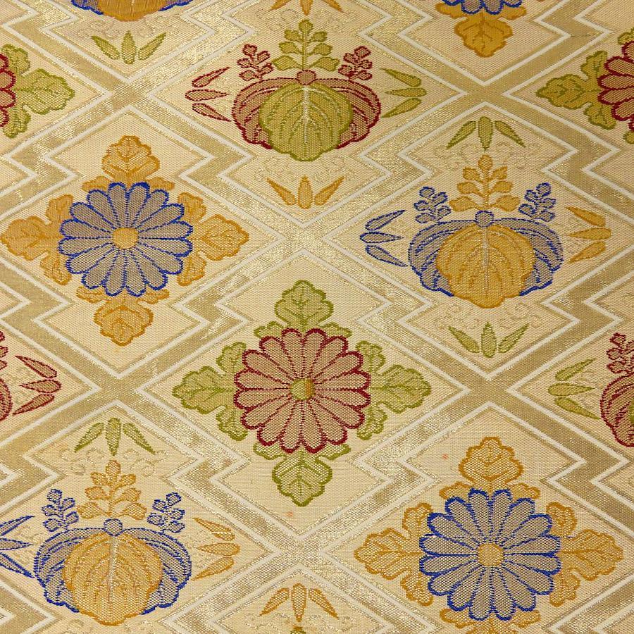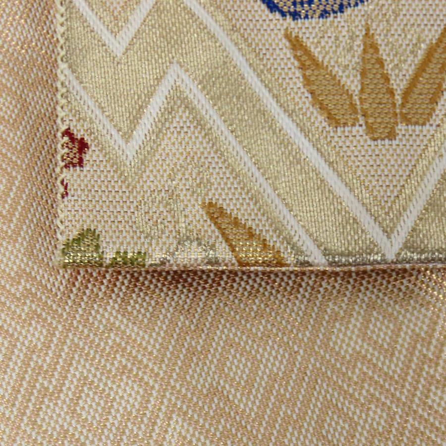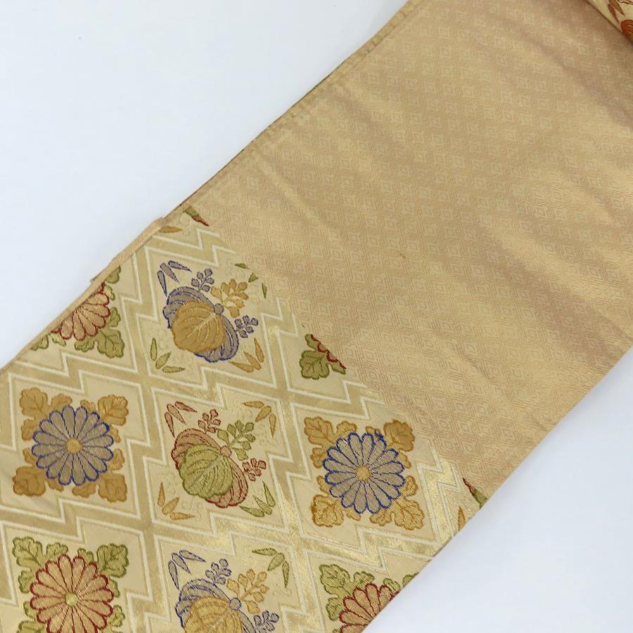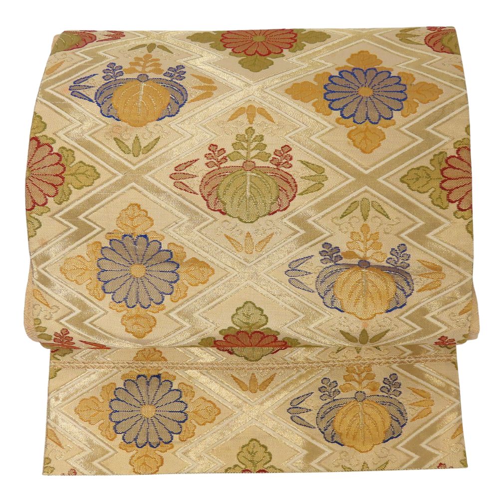 | 品名 | 【中古】 袋帯 正絹(金銀糸除く) ゴールド マルチカラー 六通柄 入子菱に菊模様 フォーマル レディース 女性 |