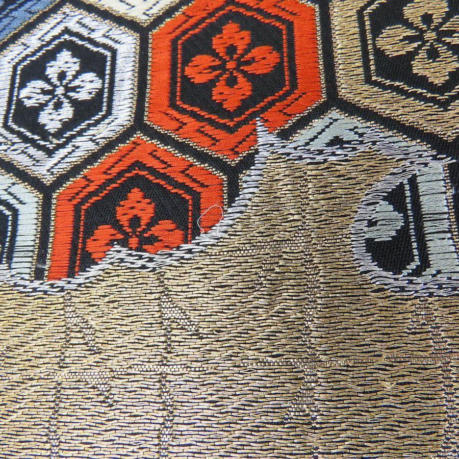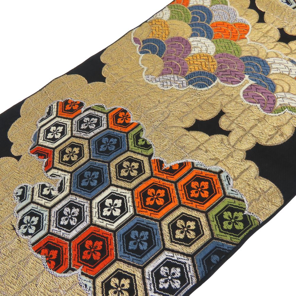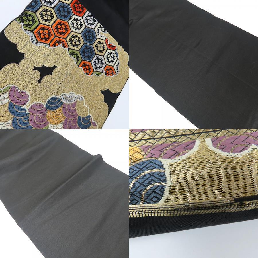 | 品名 | 【中古】 袋帯 正絹(金銀糸除く) ブラック ゴールド 花菱柄 雲取り柄 お洒落 レディース 女性 |