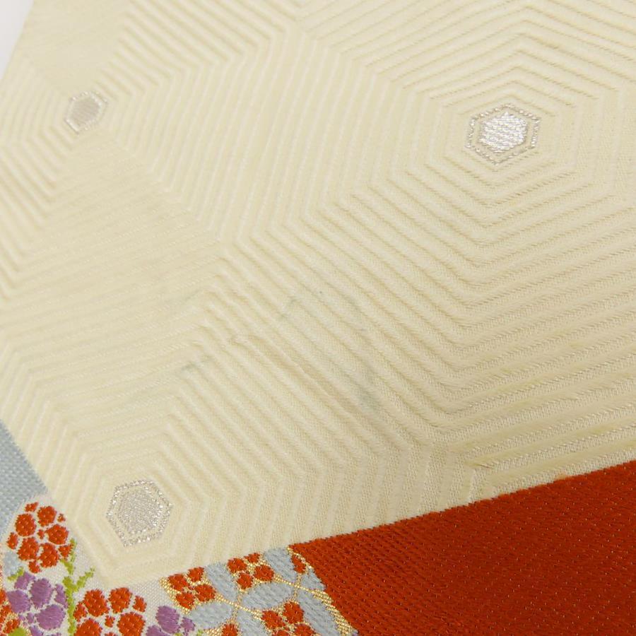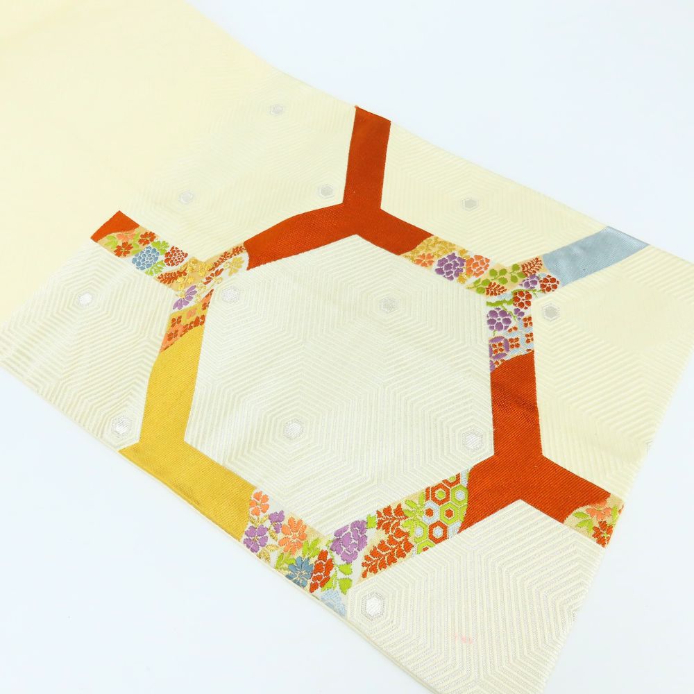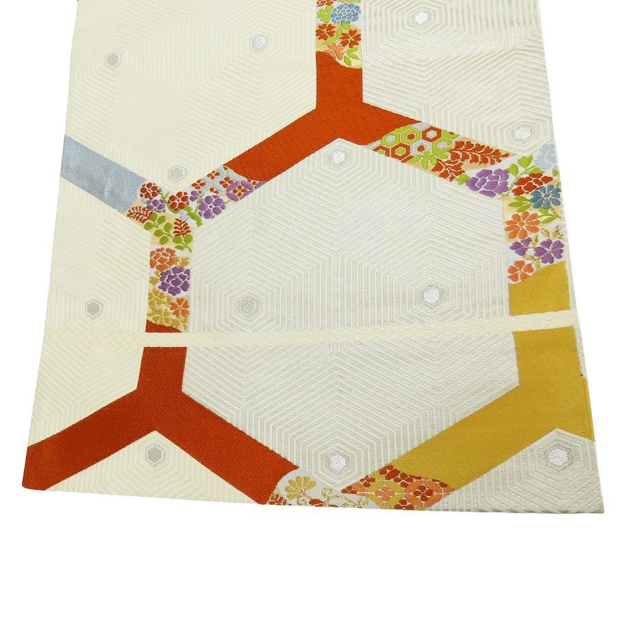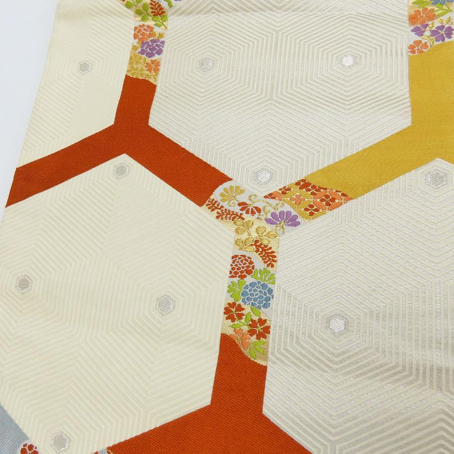 | 品名 | 【中古】 袋帯 正絹(金銀糸除く) 銀糸 ホワイト系 マルチカラー 全通柄 亀甲 古典柄 レディース 女性 |