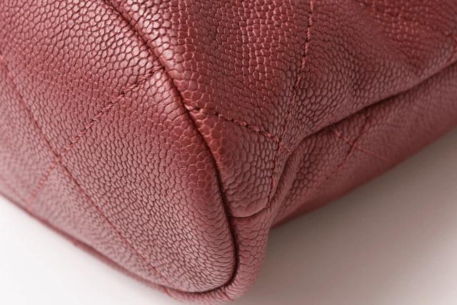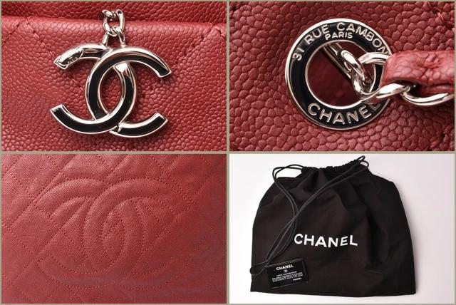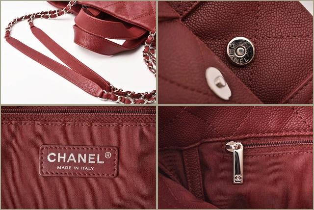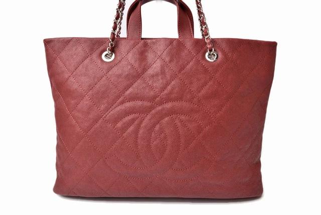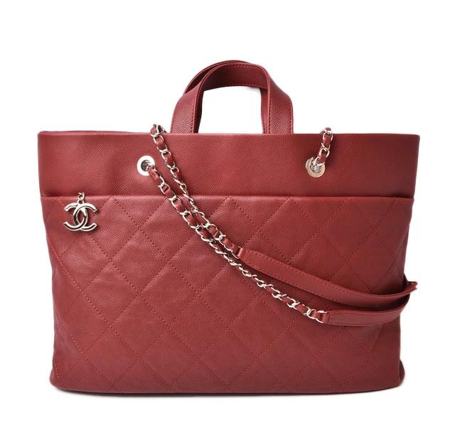 シャネルより、A4サイズの収納が可能なチェーントートバッグです。スクエア型のかちっとしたフォルム。傷の目立ちにくいキャビアスキン素材です。大き目の前後のポケットも便利。通勤通学にも最適です。