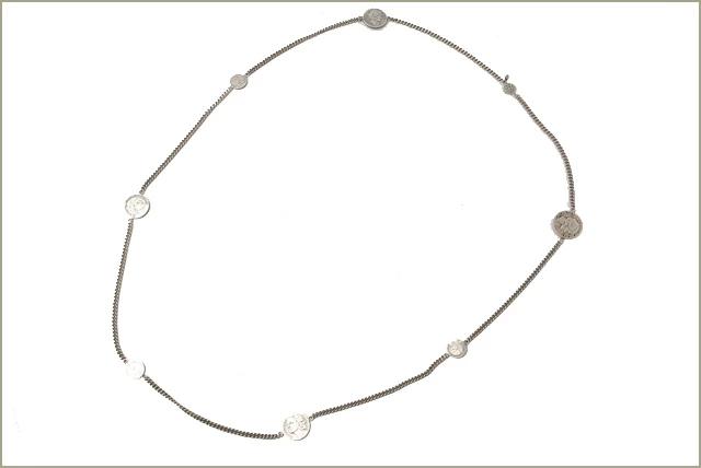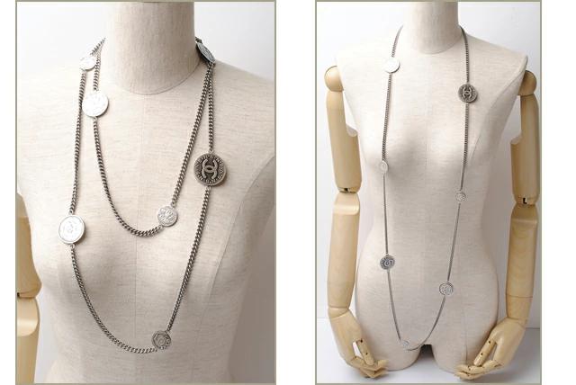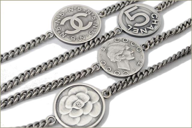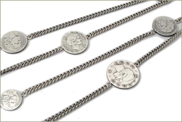 シャネルより、大きなCCマーク、マドモアゼル、No.5がモチーフのネックレスです。アンティーク調のコインが、高級感が漂います。コインが8個も、散りばめられたゴージャスなチェーンネックレスで、フォーマルから、ワンピース、パーティーシーンなどで、大活躍しそうです。