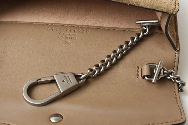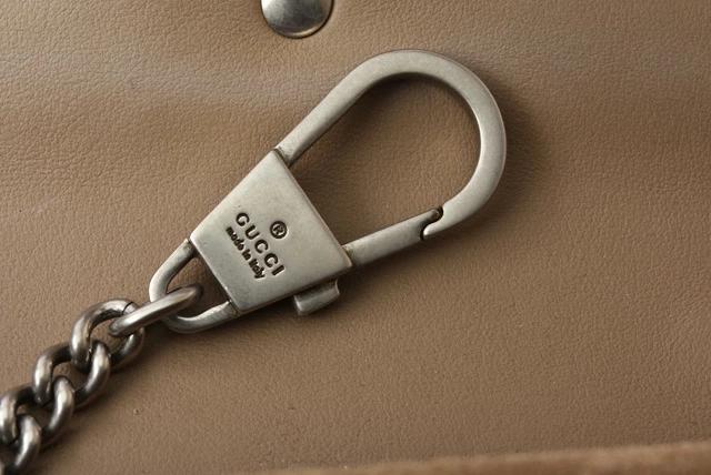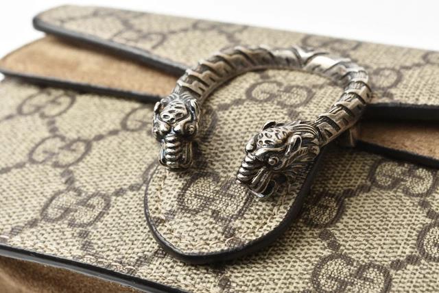 グッチより、GGスプリーム キャンバスのスーパーミニバッグです。付属のキーリングとチェーンを使用して、別の大きなバッグにこのバッグを取り付けることができます。金具には、ギリシャ神話の神ディオニュソスに由来する装飾的なタイガーヘッドがついています。とってもゴージャスです!