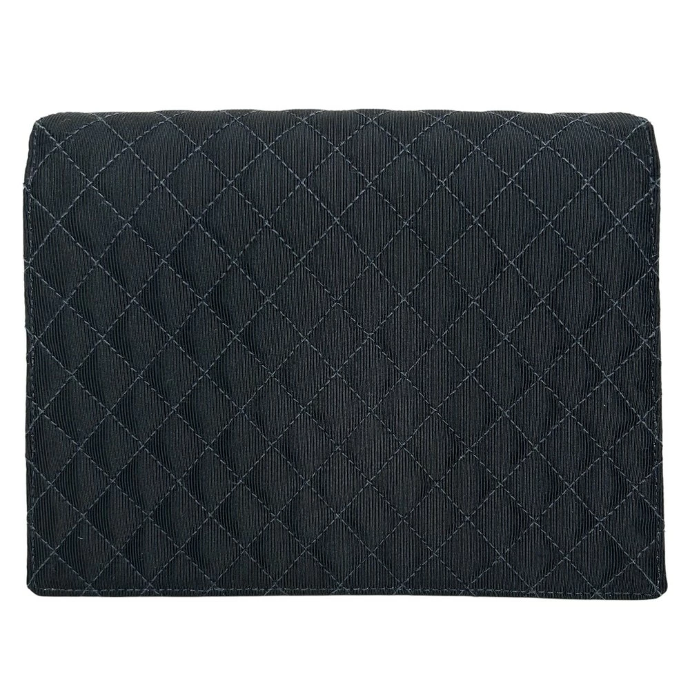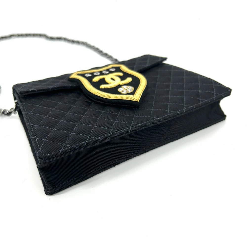 Pre-owned Chanel Women's Matelasse Shoulder Bag with Emblem Patch and Coco Mark. This chain shoulder bag can be worn over the shoulder or across the body. Made of black canvas and leather with silver hardware. Excellent condition.