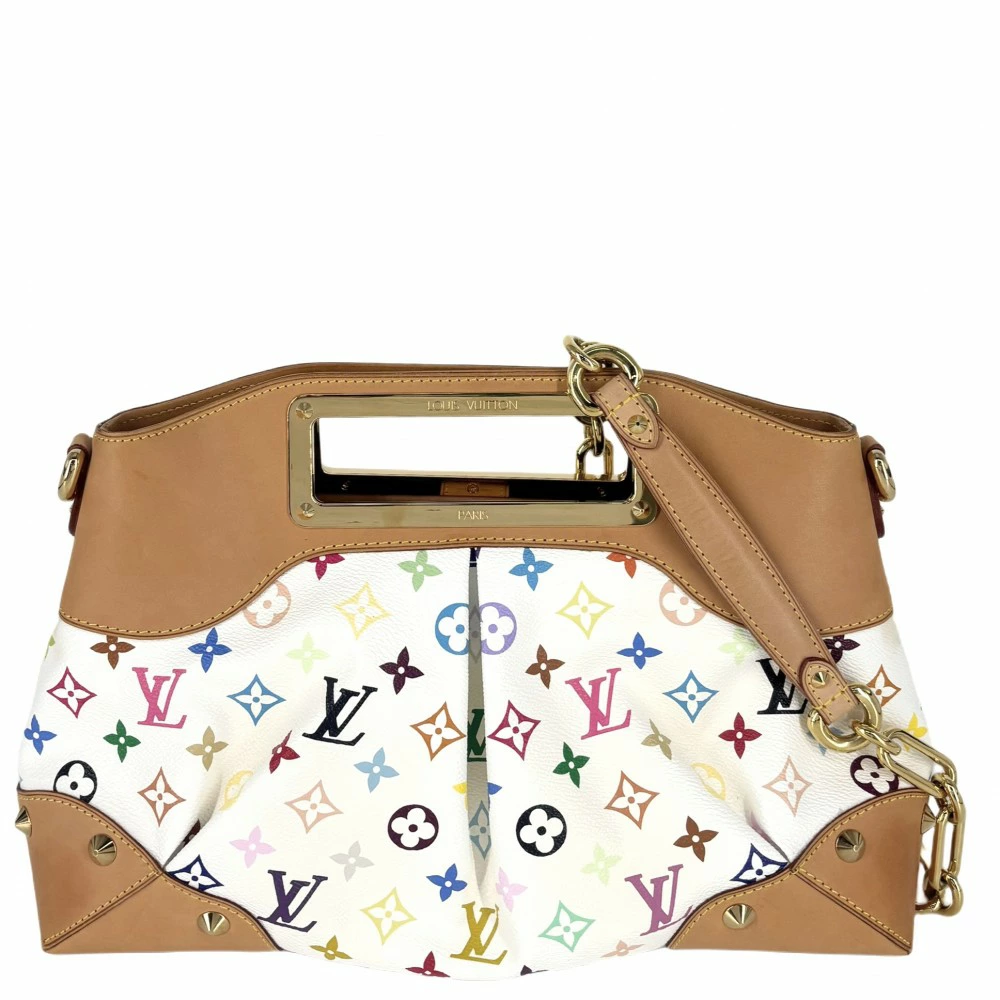Pre-owned Louis Vuitton Judy MM 2-Way Semi-Shoulder Handbag in White (M40255) with Monogram Multicolore and Gold Hardware.