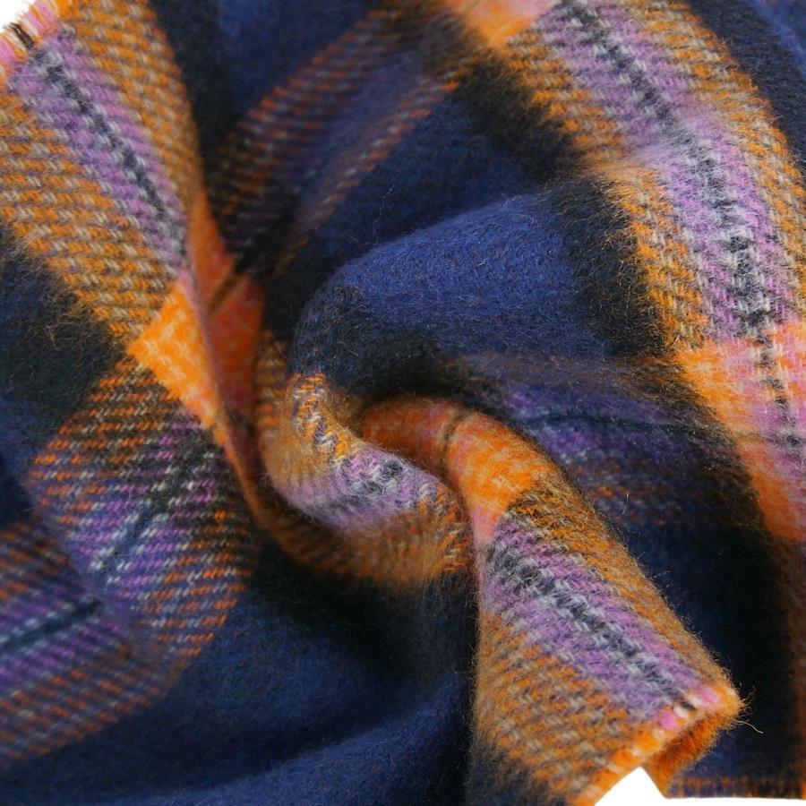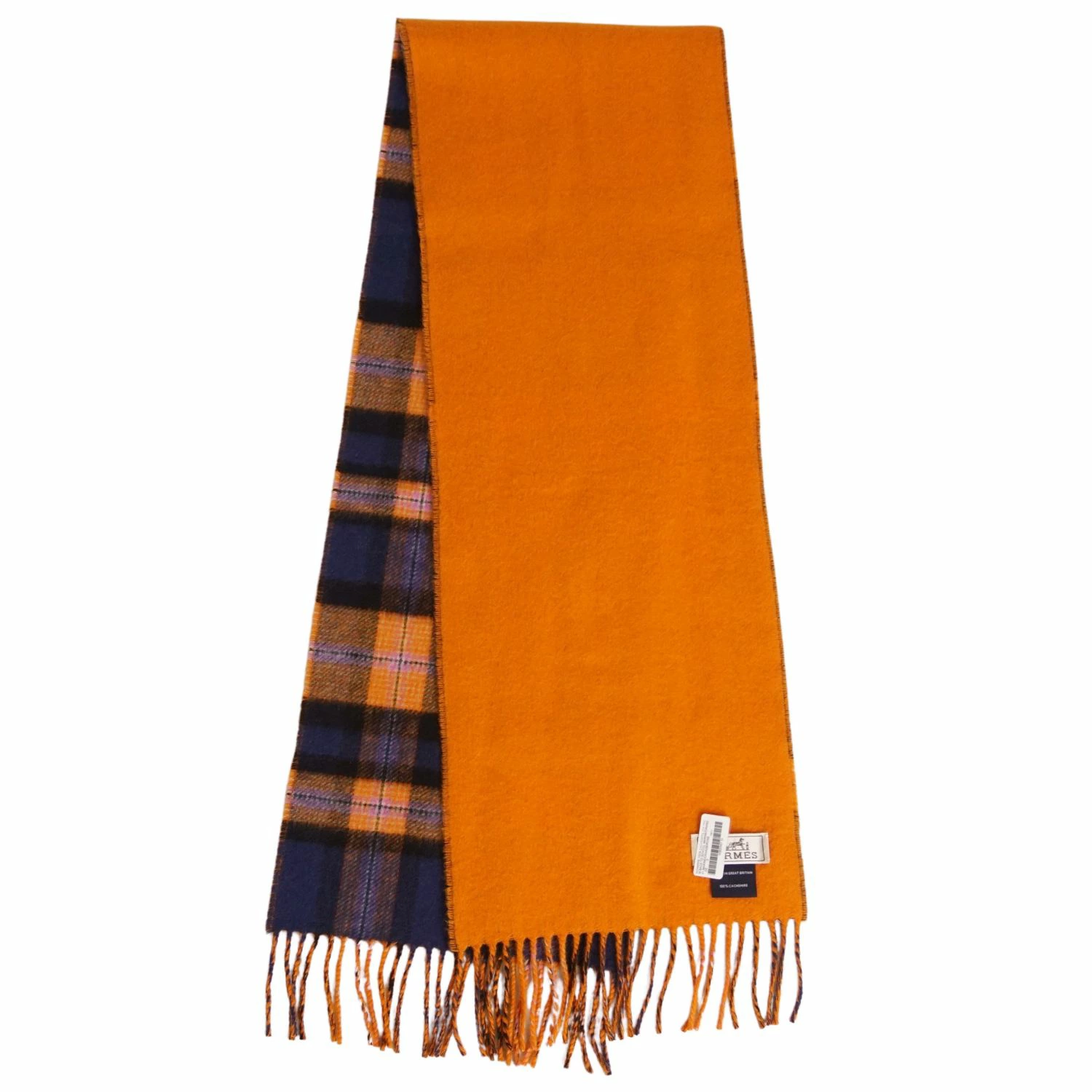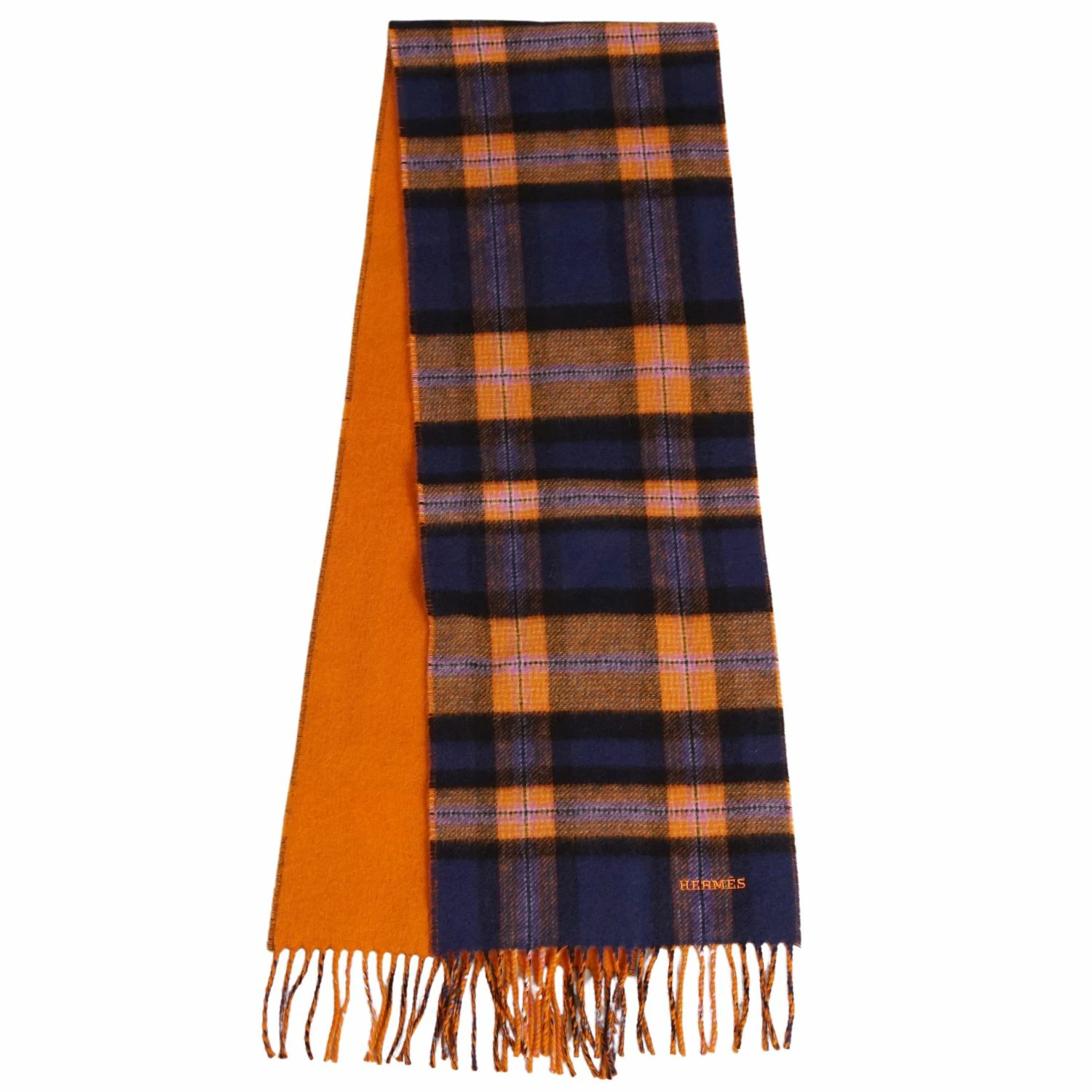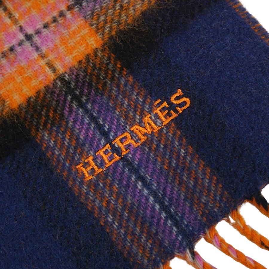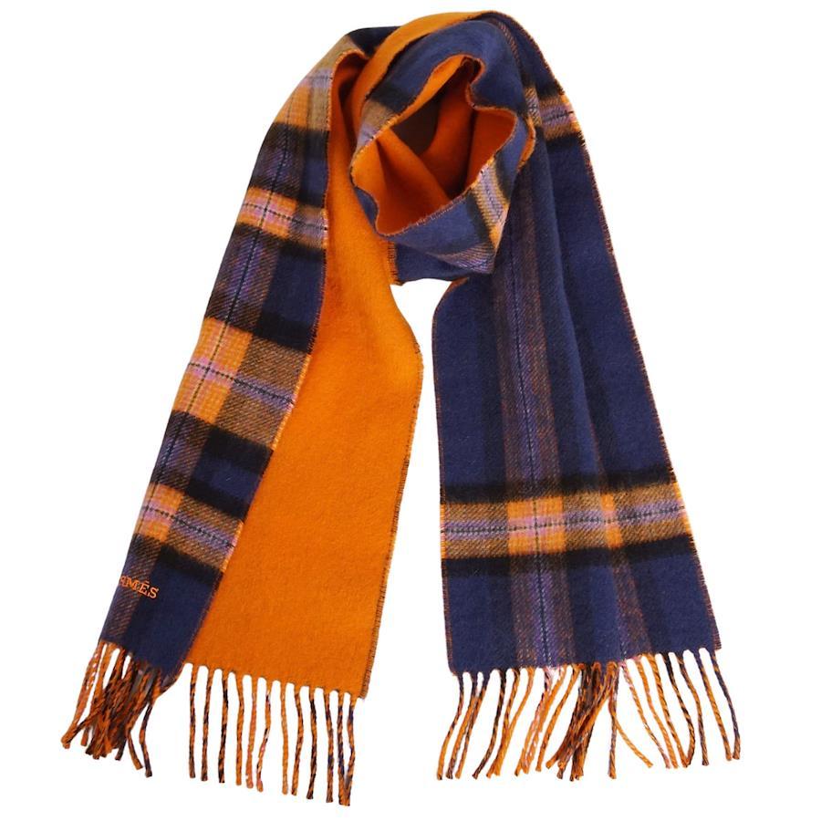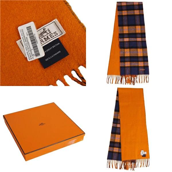 [Like New] Hermès Back to School Scarf, Check, 100% Cashmere, Made in England, Women's, Navy/Orange [Pre-owned]