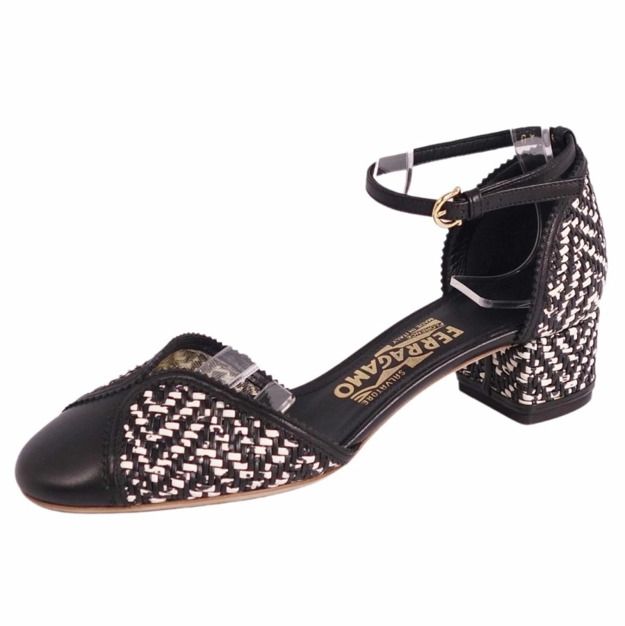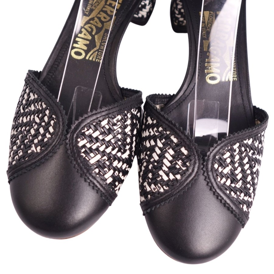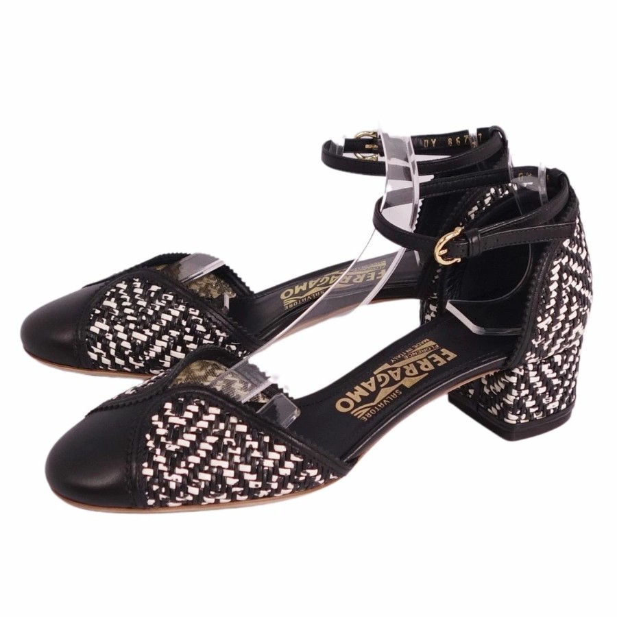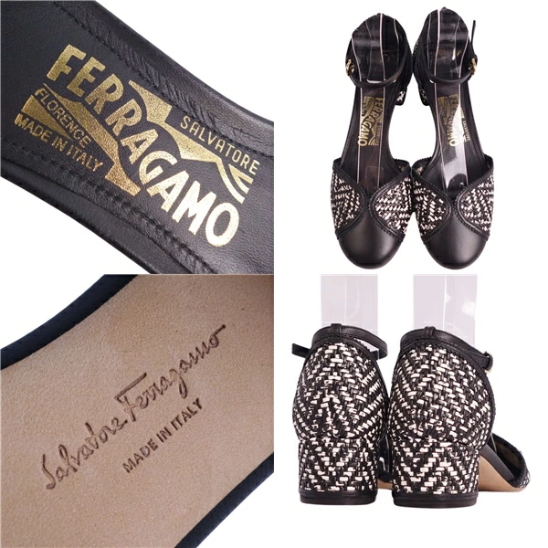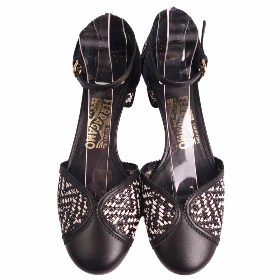 サルヴァトーレ フェラガモ Salvatore Ferragamo パンプス アンクルストラップ 編み込み レザー ヒール シューズ 靴 レディース イタリア製 ブラック/ホワイト サイズ6.5D(24cm相当)